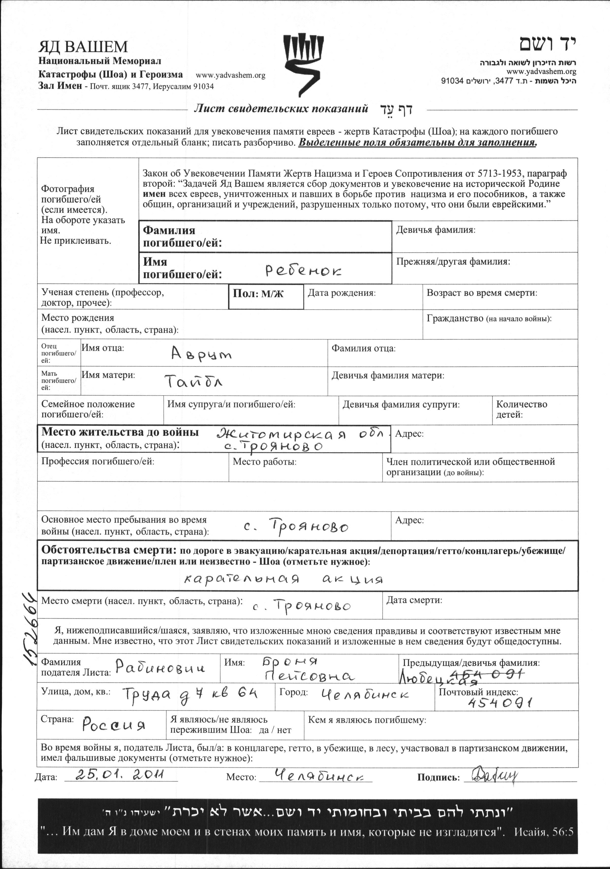 Surname unknown First name unknown Troyanov, Ukraine (USSR) Page of Testimony