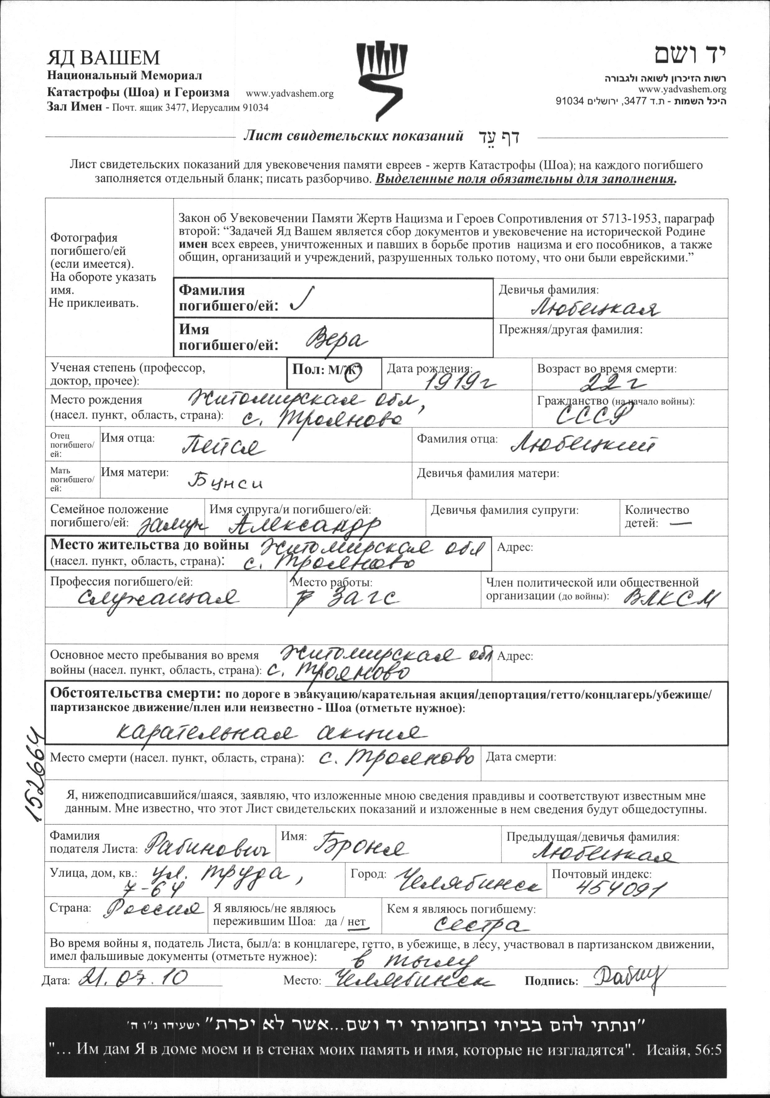 Surname unknown Vera 1919 Troyanov, Ukraine (USSR) Page of Testimony
