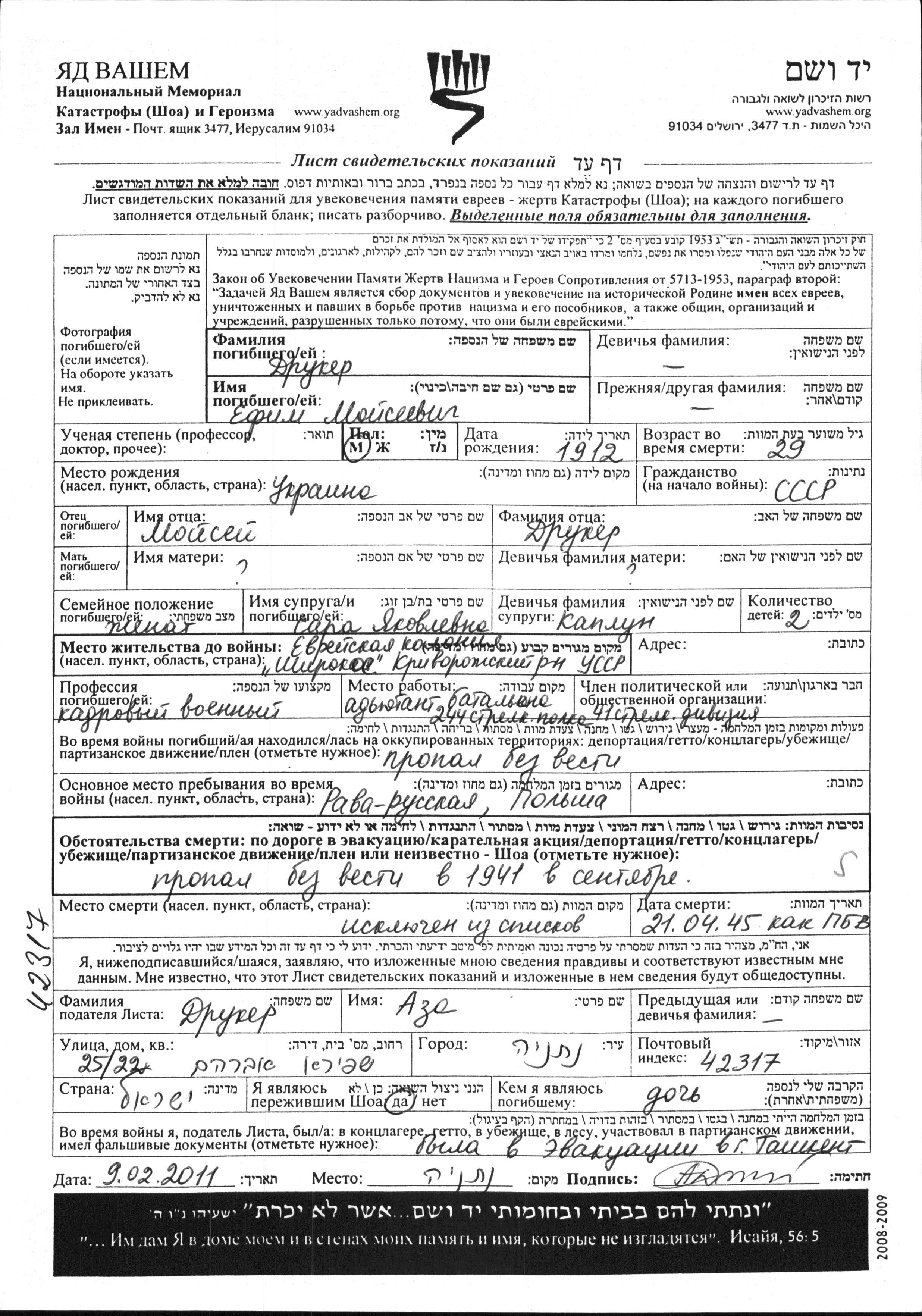 Yefim Druker was born in Ukraine (USSR), 1912 to Moisei. He was a military man and married to Sara nee Kaplun. Prior to WWII he lived in Shirokoye, Ukraine (USSR). During the war he was in the Soviet armed forces. Yefim was murdered in the Shoah. Place of death: Rawa Ruska, Poland, 09/1941.