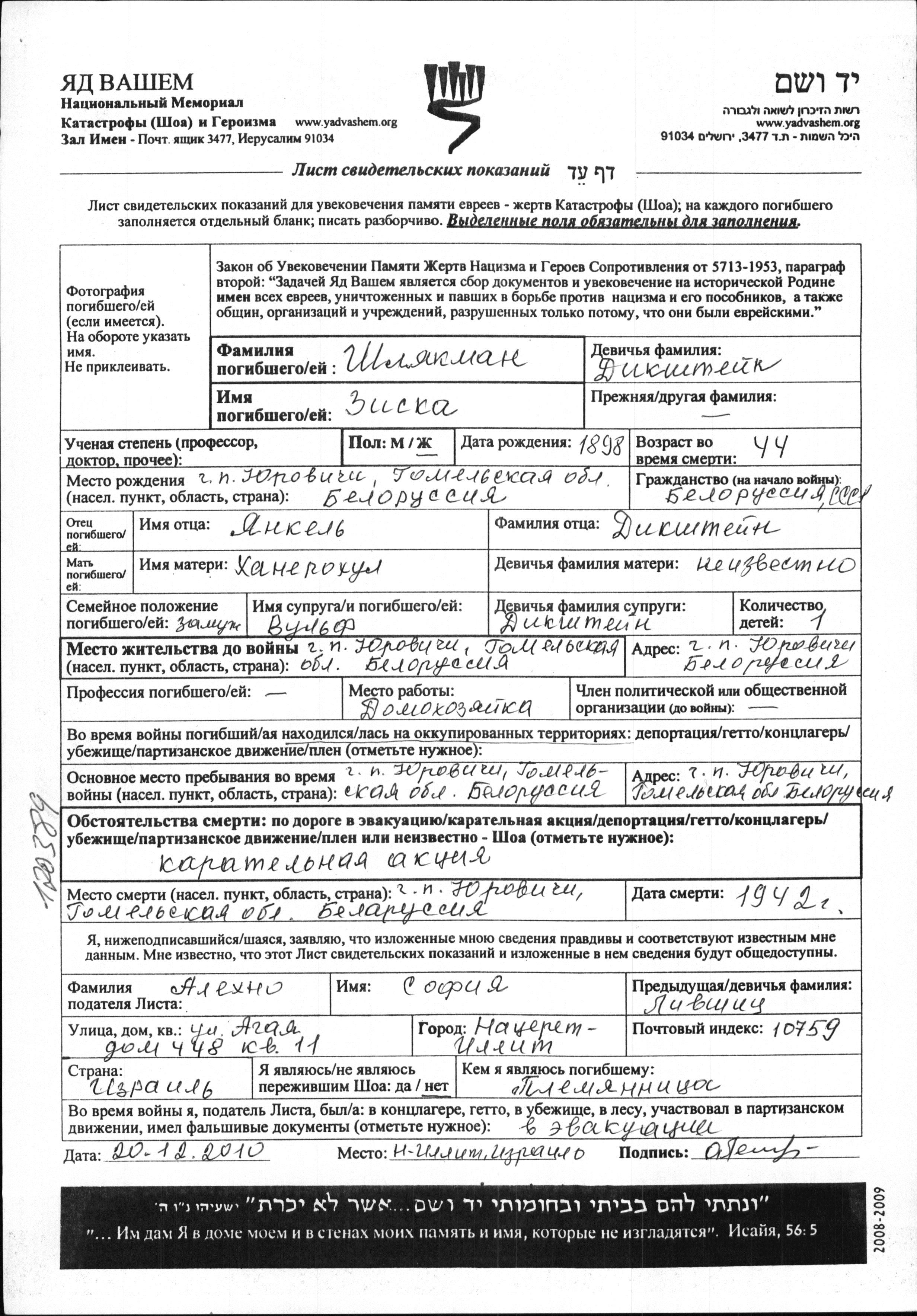 Shlyakman Ziska 1898 Yurovichi, Belorussia (USSR) Page of Testimony