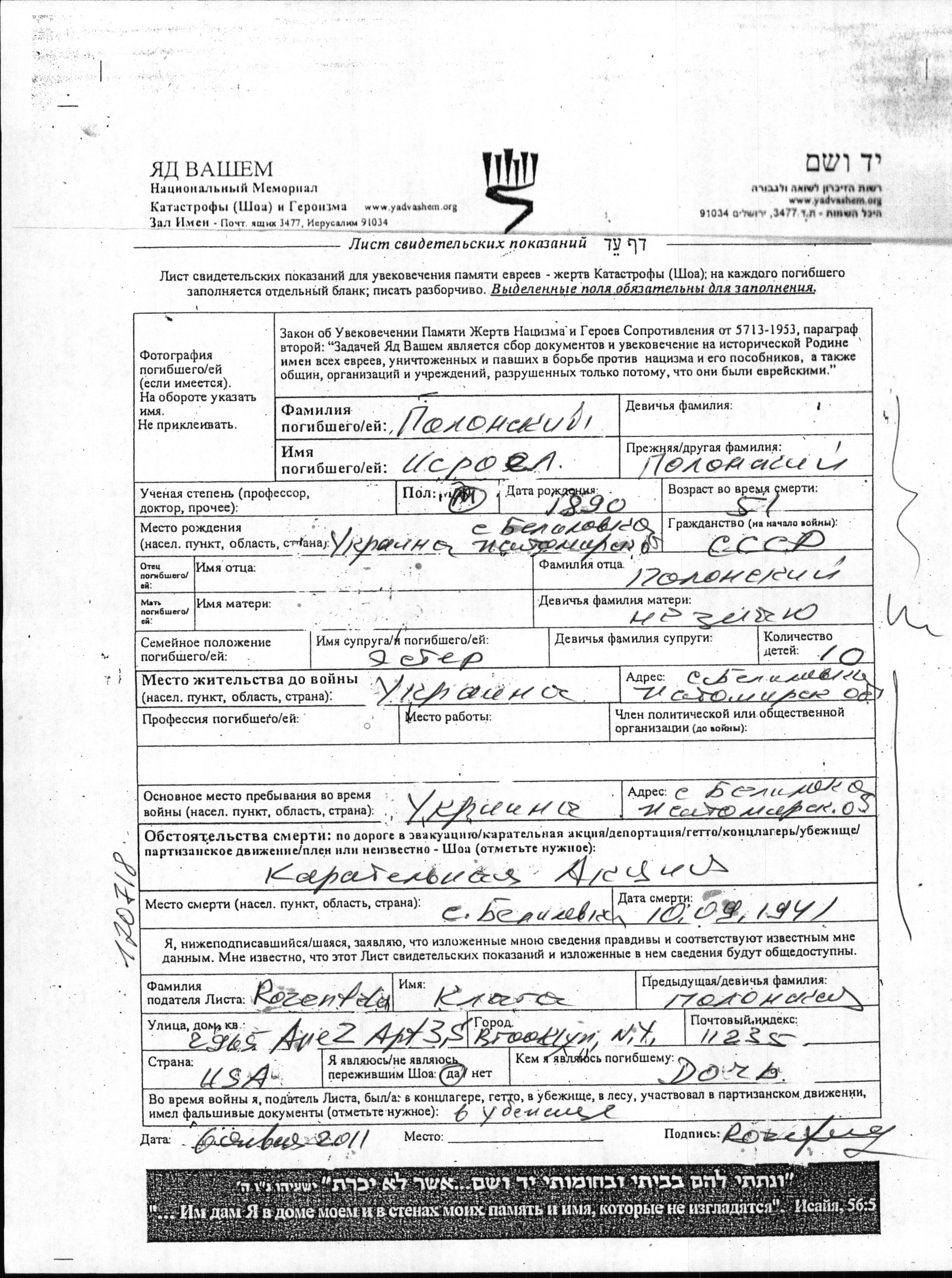 Polonski Isroel 1890 Belilovka, Ukraine (USSR) Page of Testimony