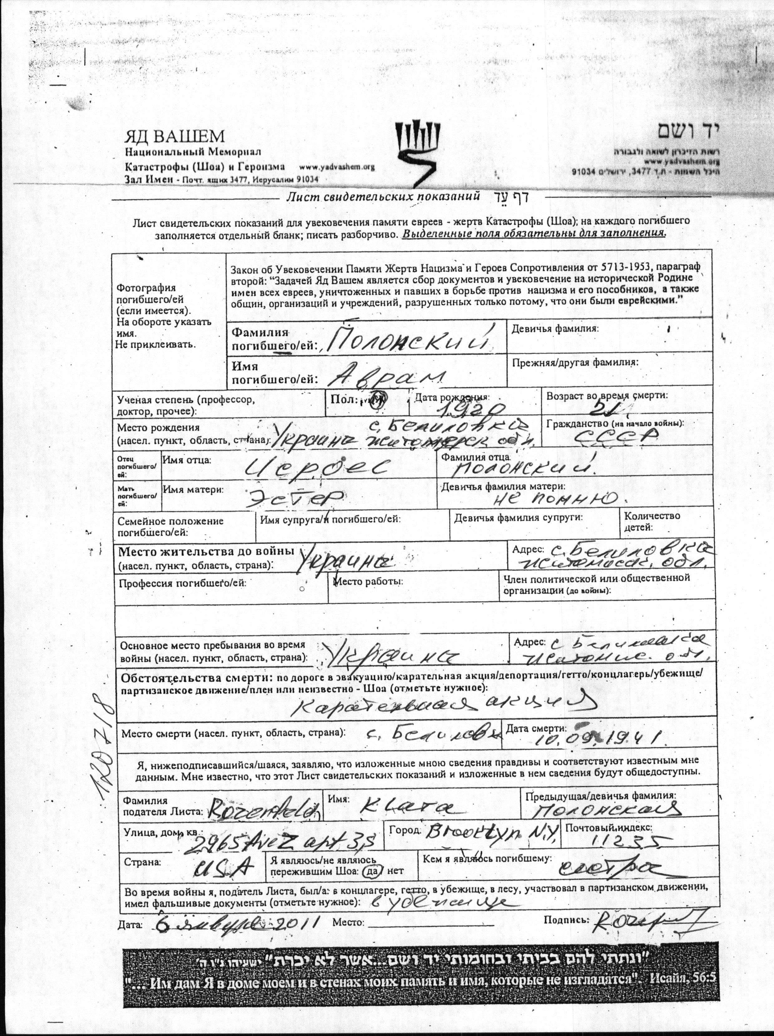 Polonski Avram 1920 Belilovka, Ukraine (USSR) Page of Testimony