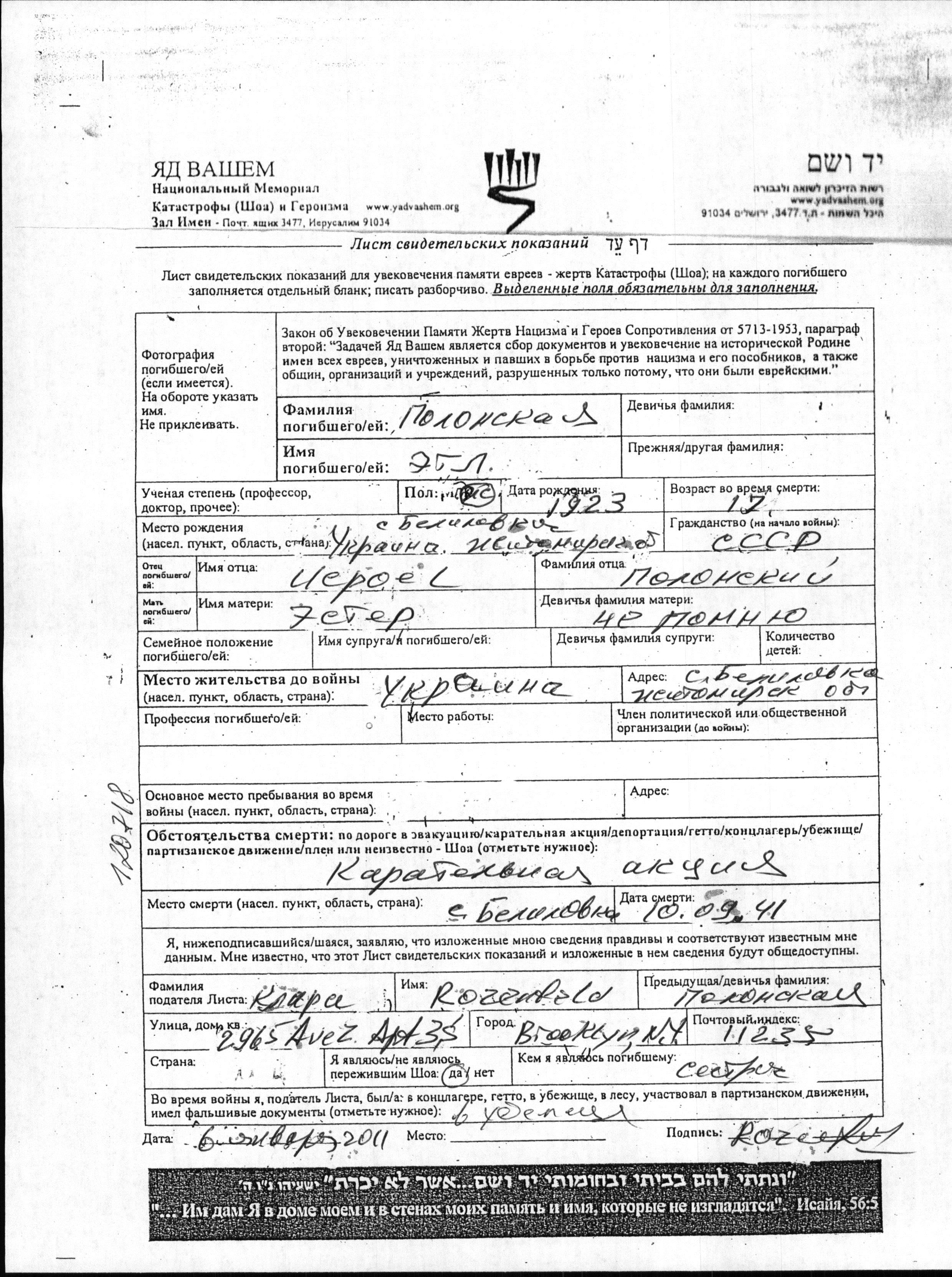 Polonskaya Etl 1923 Belilovka, Ukraine (USSR) Page of Testimony