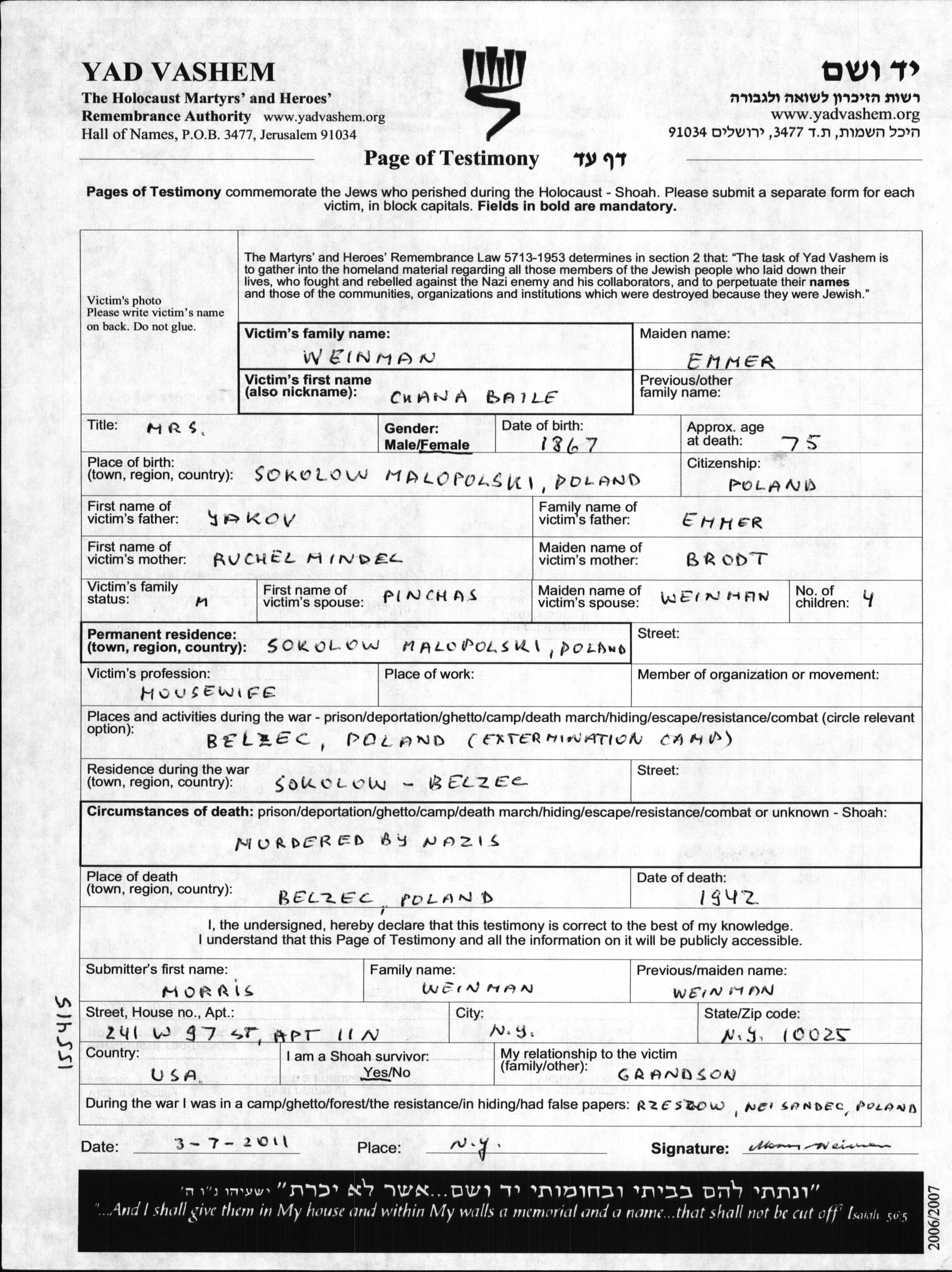 Chana Baile Weinman nee Emmer was born in Sokolow Malopolski, Poland, 1867 to Yakov and Ruchel Mindel nee Brodt. She was a housewife and married to Pinchas. Prior to WWII she lived in Sokolow Malopolski, Poland. During the war she was in Sokolow Malopolski, Poland. Chana Baile was murdered in the Shoah. Place of death: Belzec, Poland, 1942.