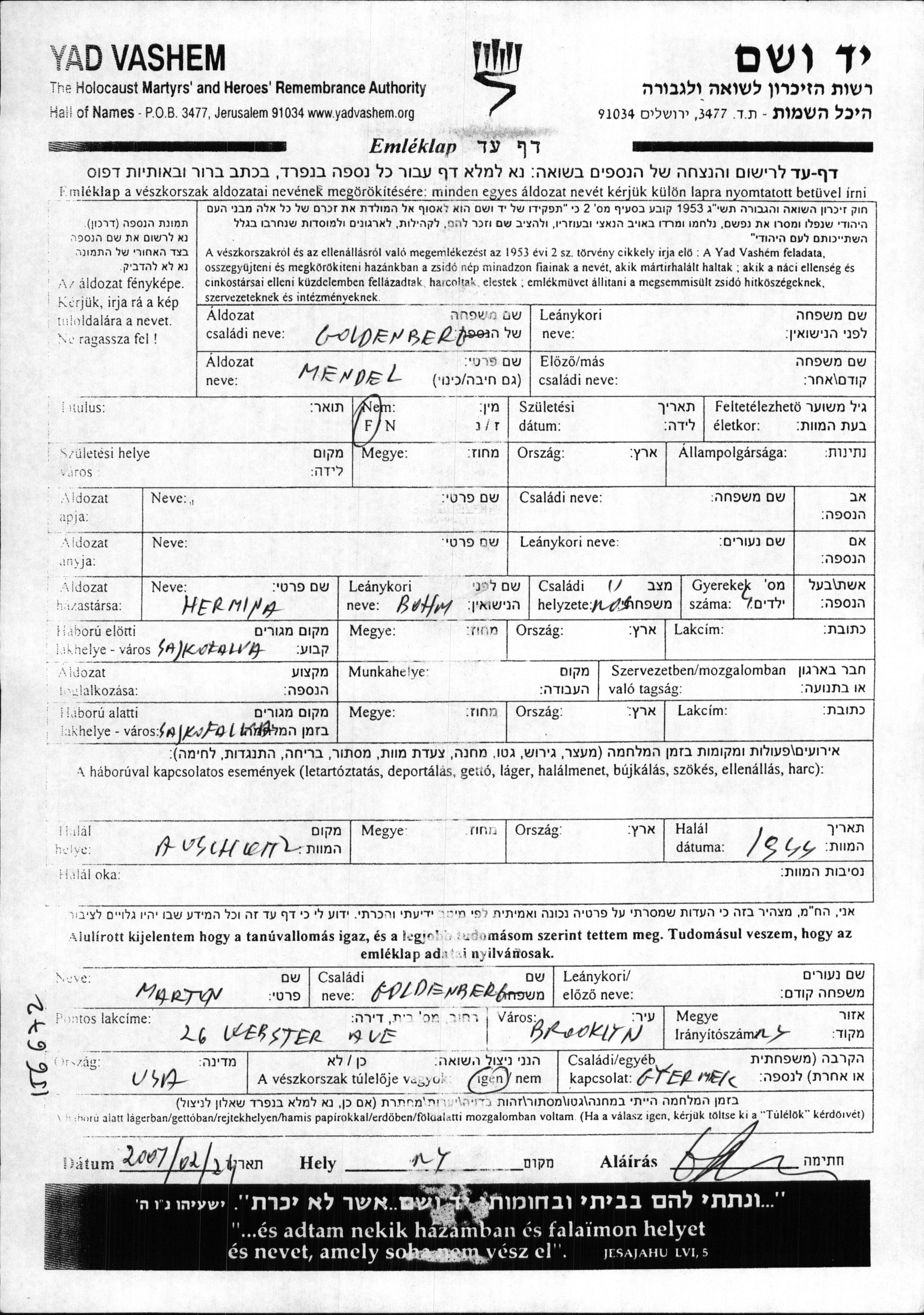 Mendel was murdered in the Shoah. Place of death: Auschwitz, Poland, 1944.