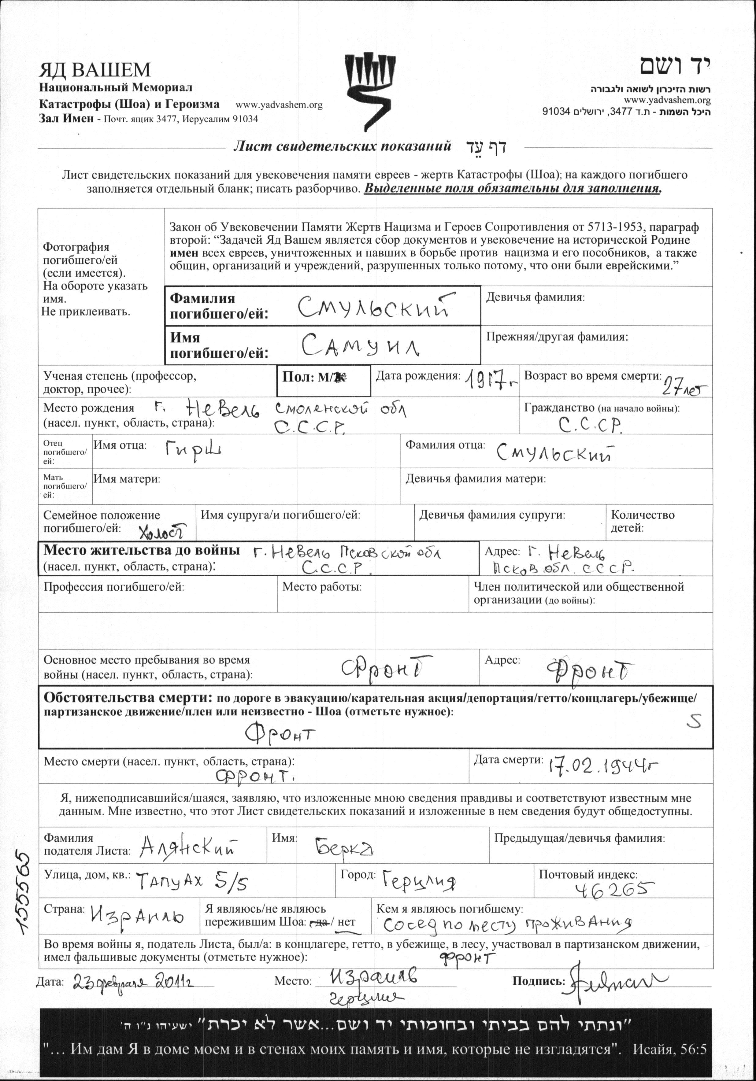 Samuil Smulski was born in Nevel, Russia (USSR), 1917 to Girsh. He was single. Prior to WWII he lived in Nevel, Russia (USSR). During the war he was in the Soviet armed forces. Samuil was killed in military service in WWII. Place of death: unknown, 17/02/1944.
