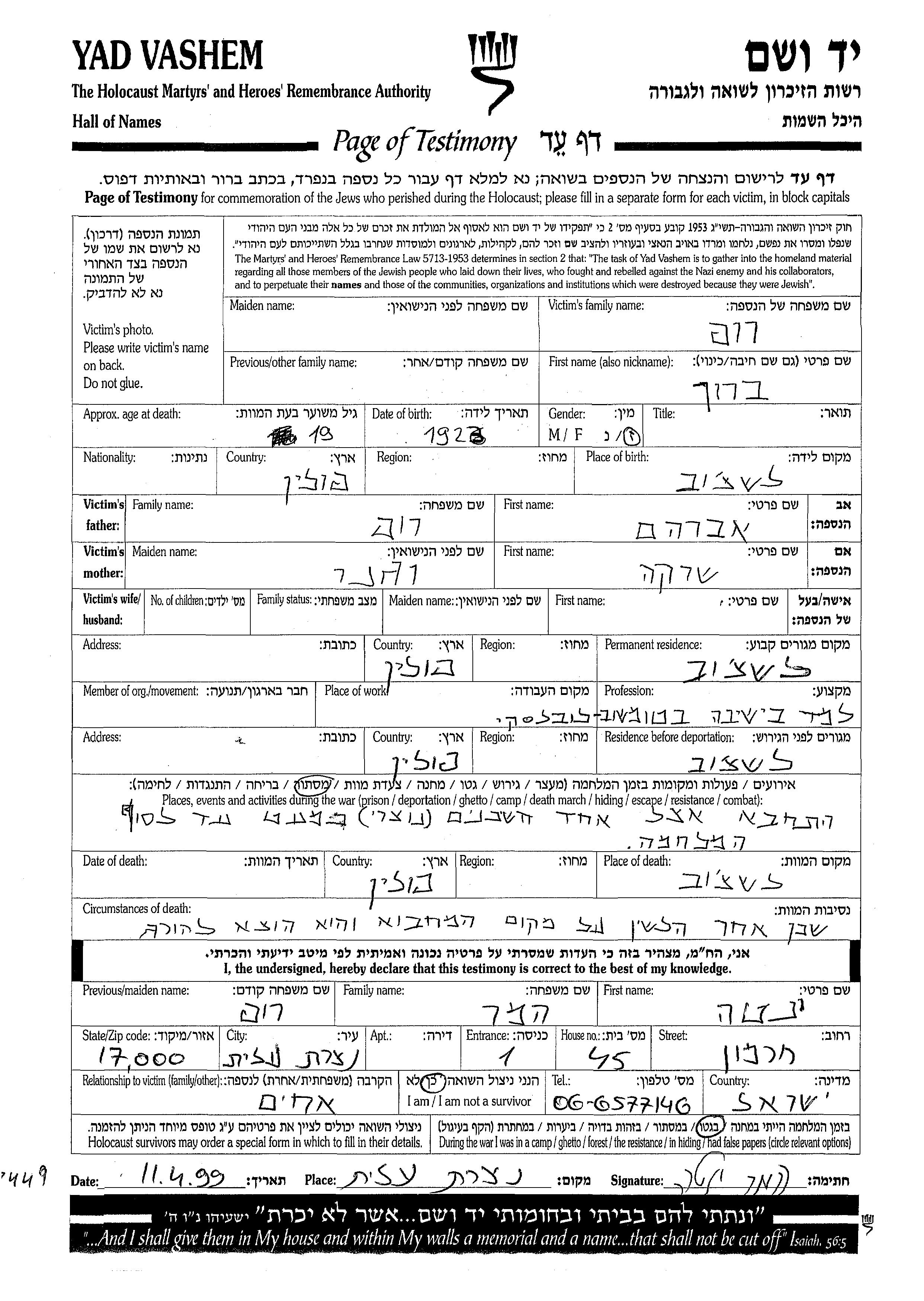 Barukh Rup was born in Laszczow, Poland, 1923 to Avraham and Sarka. He was a yeshiva student. Prior to WWII he lived in Laszczow, Poland. During the war he was in Laszczow, Poland. Barukh was murdered in the Shoah. Place of death: Laszczow, Poland.