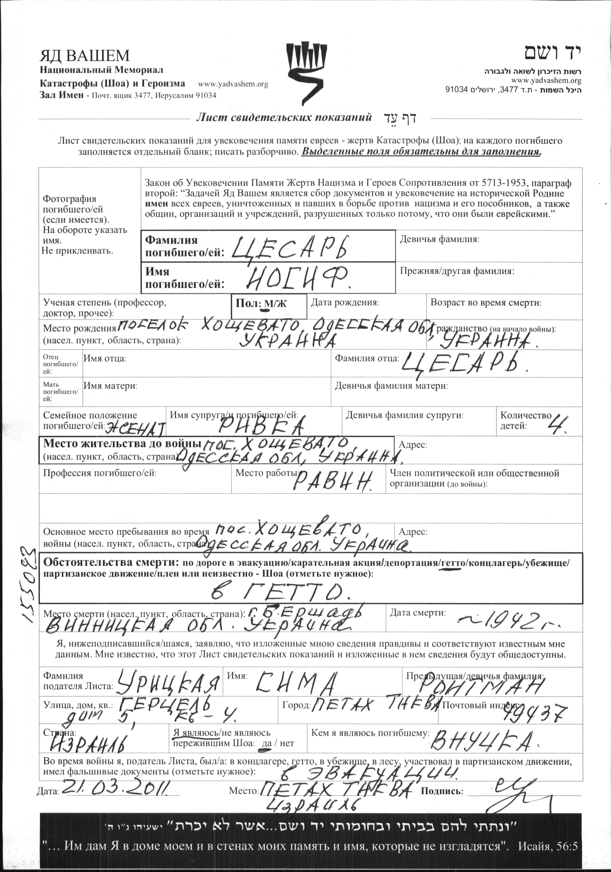 Yad Vashem - Pages of Testimony Names Memorial Collection