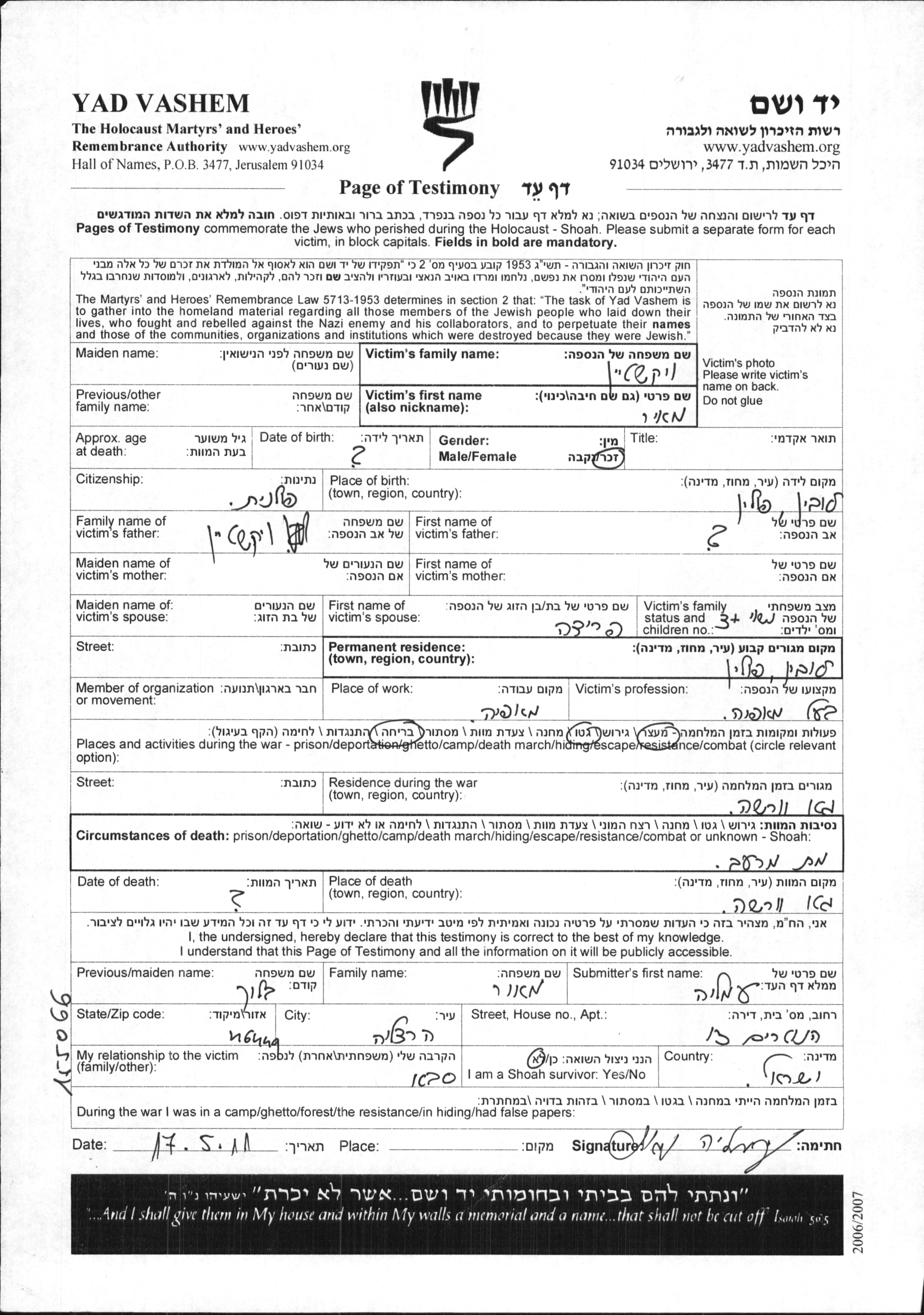 Yad Vashem - Pages of Testimony Names Memorial Collection