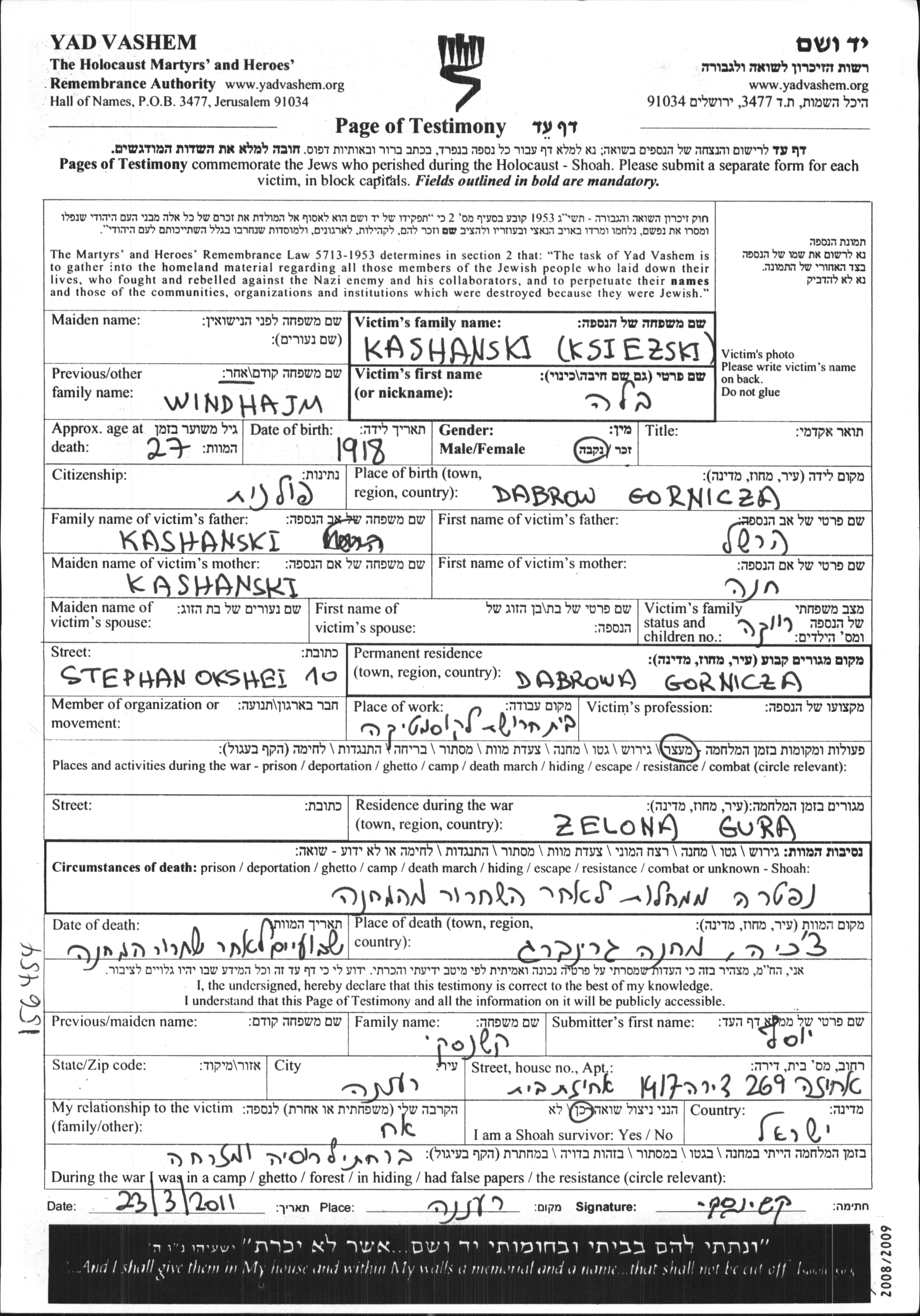 Bela Kashanski Ksiezski Windhajm was born in Dabrowa Gornicza, Poland, 1918 to Hershel and Chana. She was single. Prior to WWII she lived in Dabrowa Gornicza, Poland. During the war she was in Zielona Gora, Germany. Bela was murdered in the Shoah. Place of death: Gruenberg in Schlesien, Germany.