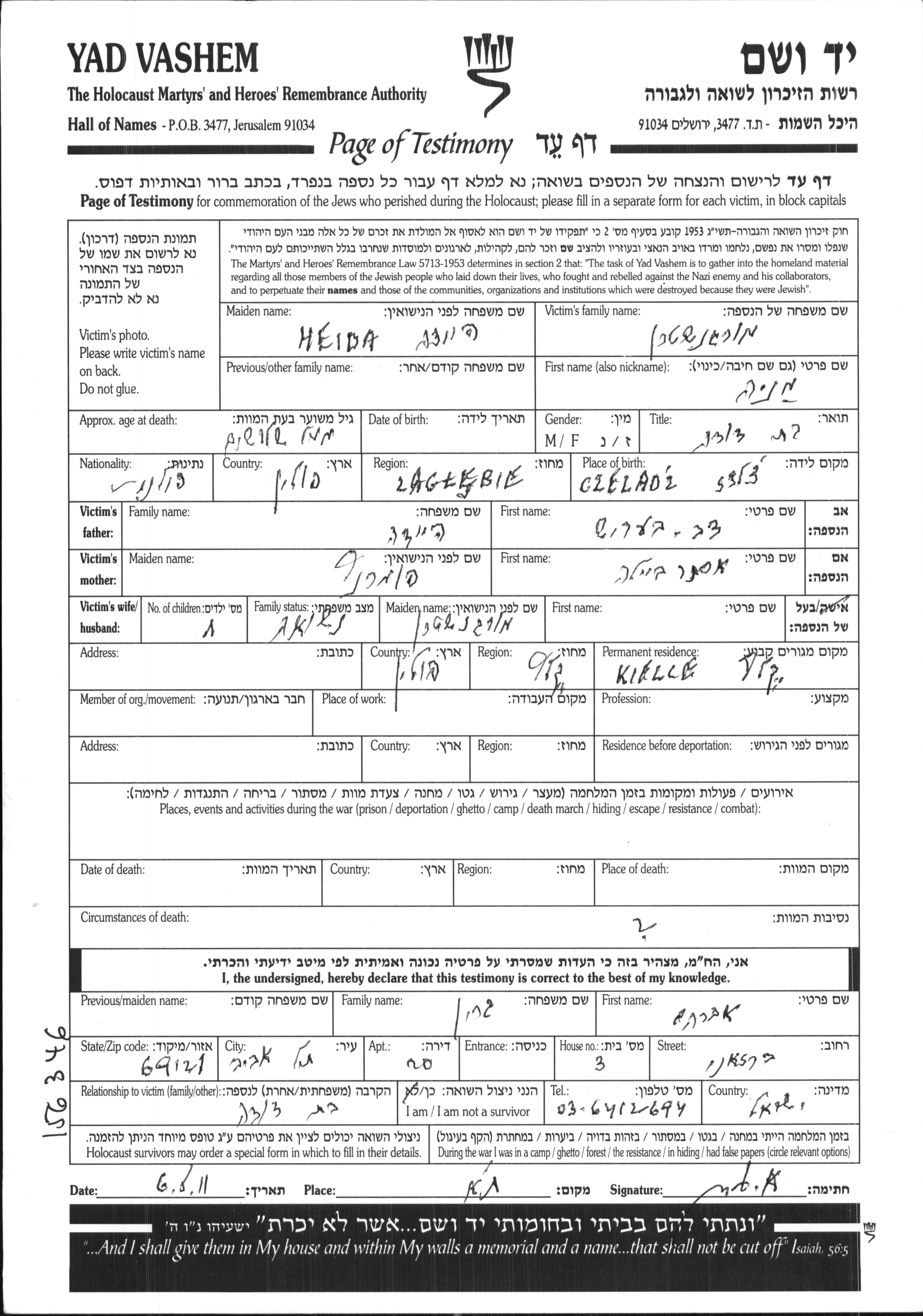 Mania Morgenshtern nee Heida was born in Czeladz, Poland to Dov Berish and Ester Beila nee Pomerantz. She was married. Prior to WWII she lived in Kielce, Poland. Mania was murdered in the Shoah.