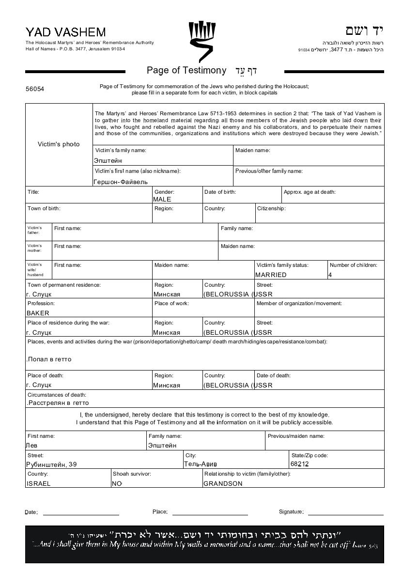 Gershon Faivel Epshtein. He was a baker and married. Prior to WWII he lived in Slutsk, Belorussia (USSR). During the war he was in Slutsk, Belorussia (USSR).