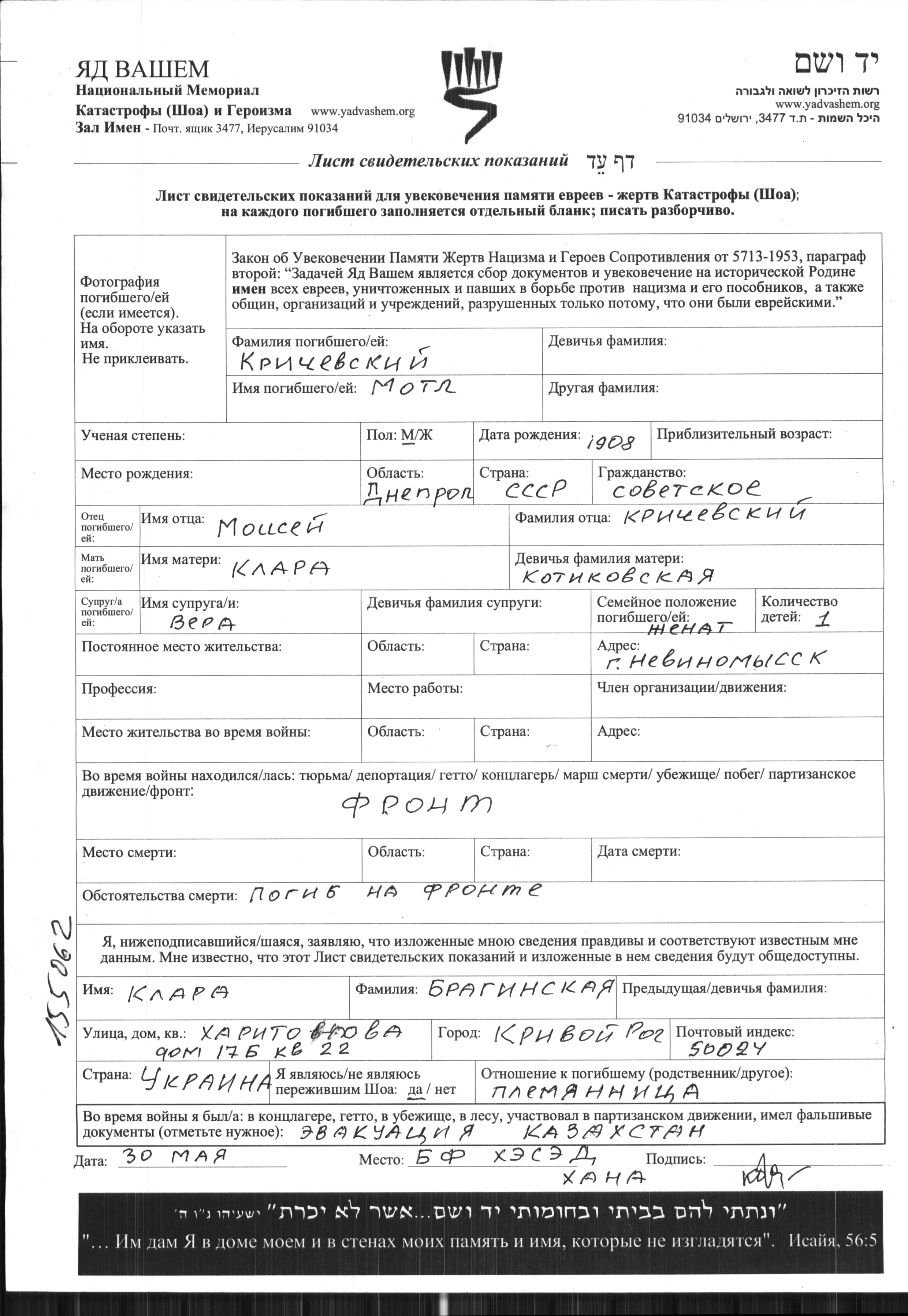 Motl Krichevskiy was born in Dnepropetrovsk, Ukraine (USSR), 1908 to Moisey and Klara nee Kotikovskaya. He was married to Vera. Prior to WWII he lived in Nevinnomyssk, Russia (USSR). During the war he was in the Soviet armed forces. Motl was killed in military service in WWII.