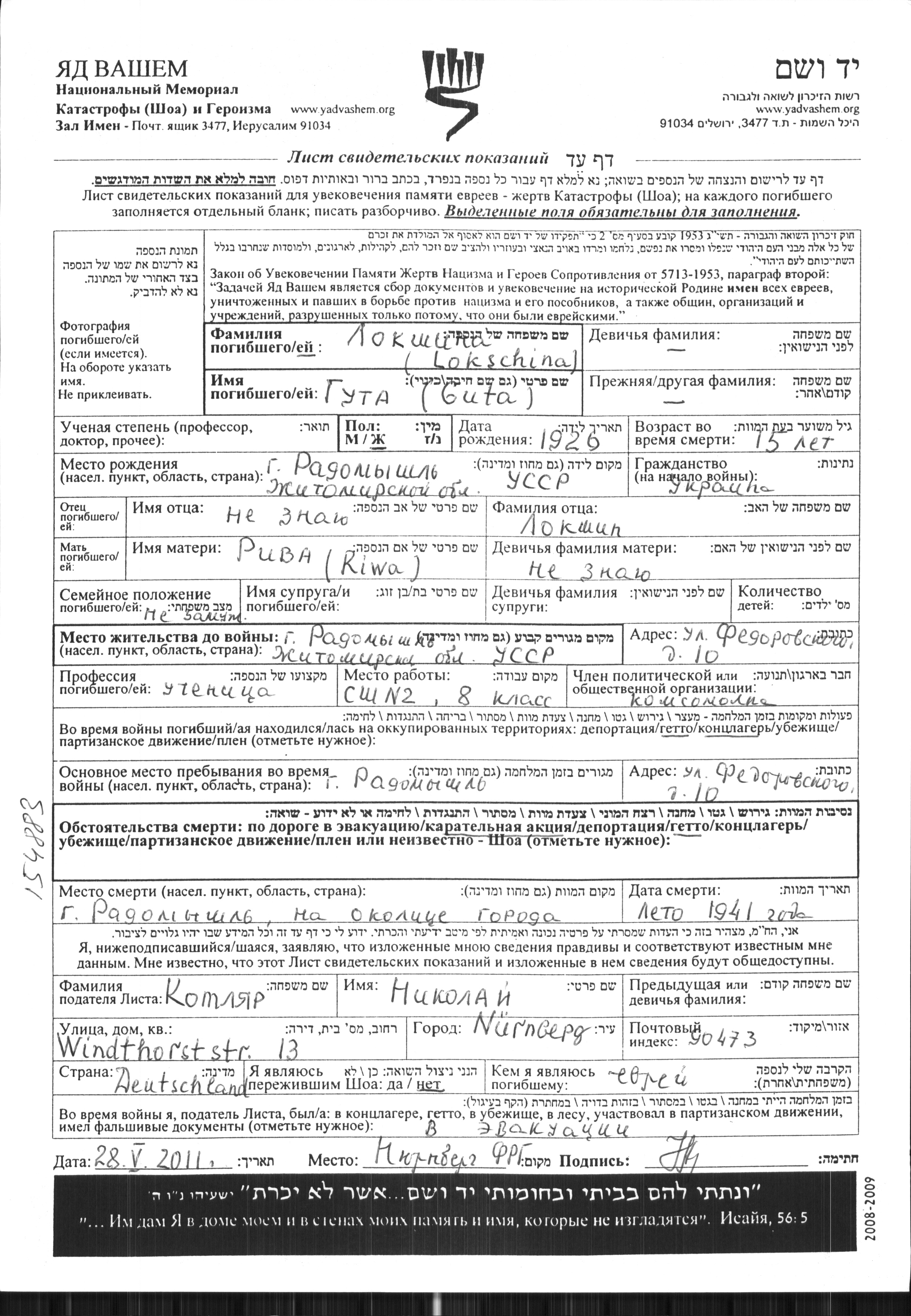 Lokschina Guta 1926 Radomyshl, Ukraine (USSR) Page of Testimony