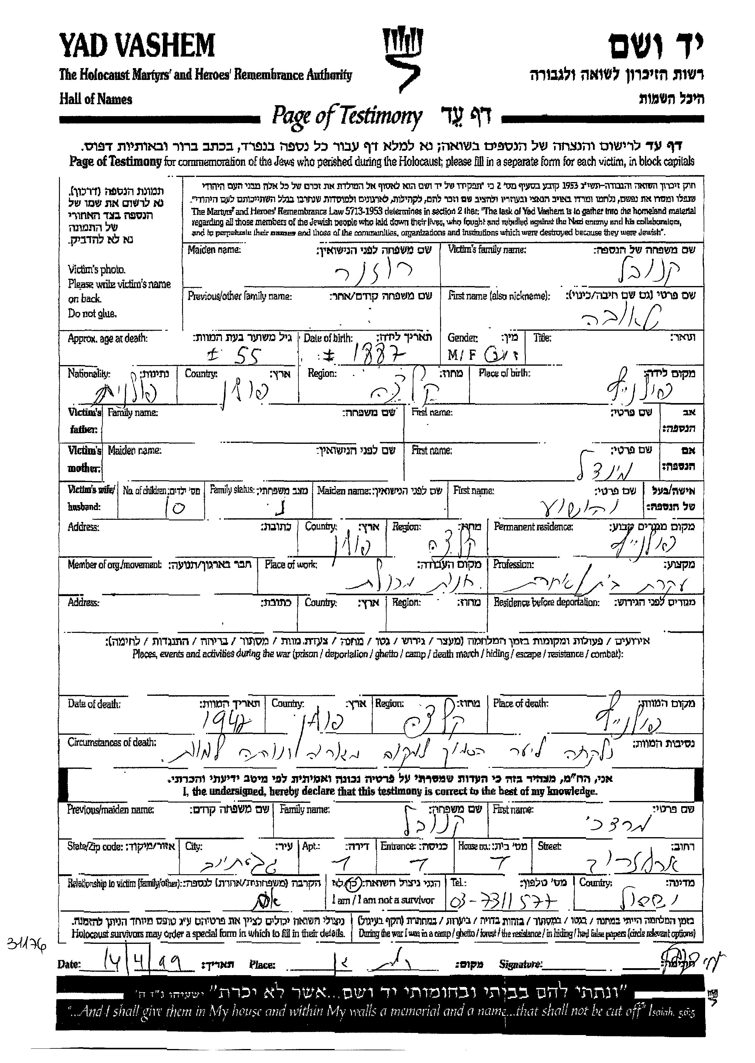 Tauba Knobel nee Rozner was born in Polaniec, Poland, 1887 to Mindl. She was a housewife and married to Yehoshua. Prior to WWII she lived in Polaniec, Poland. Tauba was murdered in the Shoah. Place of death: Polaniec, Poland, 1942.