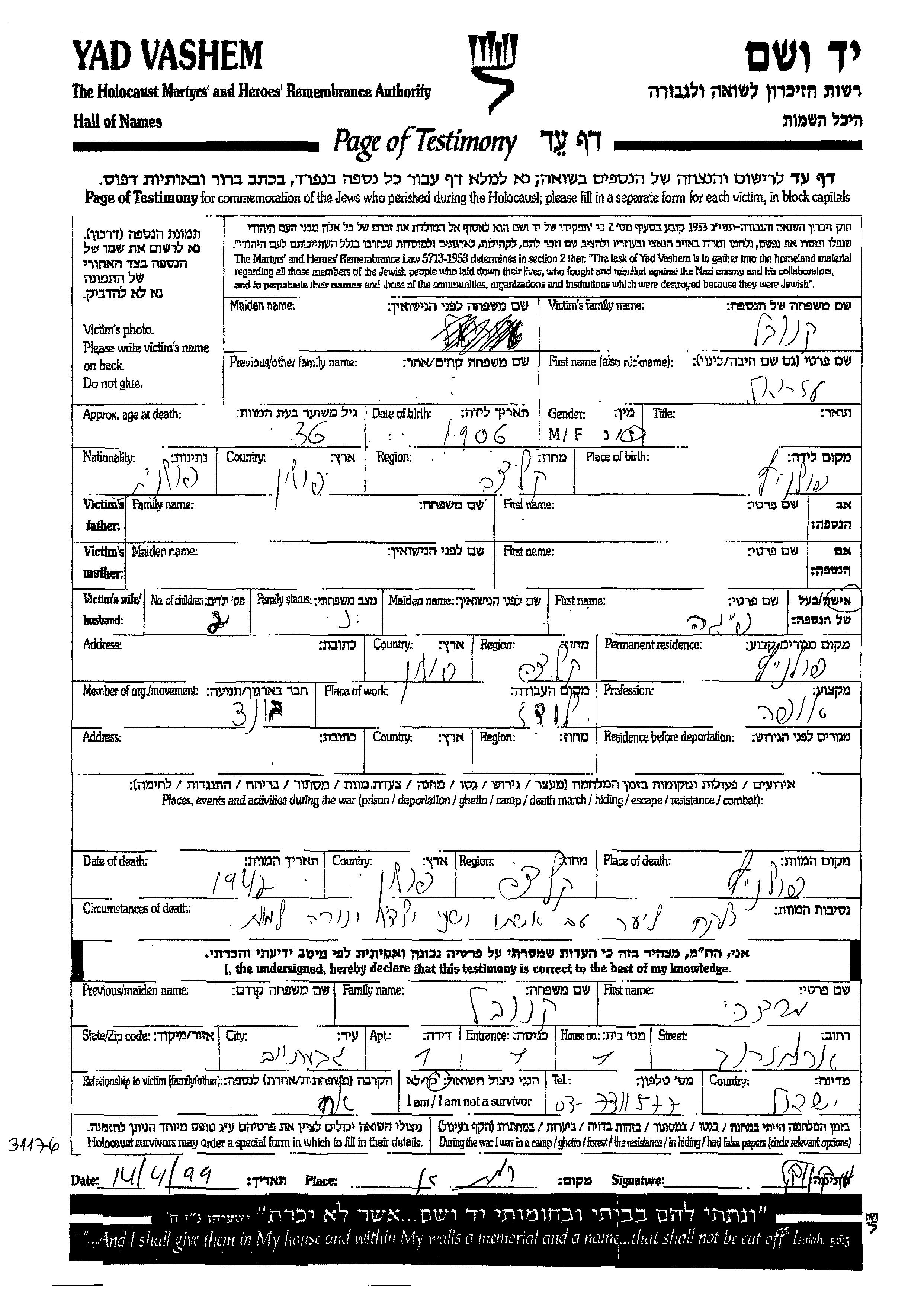 Azriel Knobel was born in Polaniec, Poland, 1906. He was a baker and married to Feiga. Prior to WWII he lived in Polaniec, Poland. During the war he was in Polaniec, Poland. Azriel was murdered in the Shoah. Place of death: Polanec, Poland, 1942.