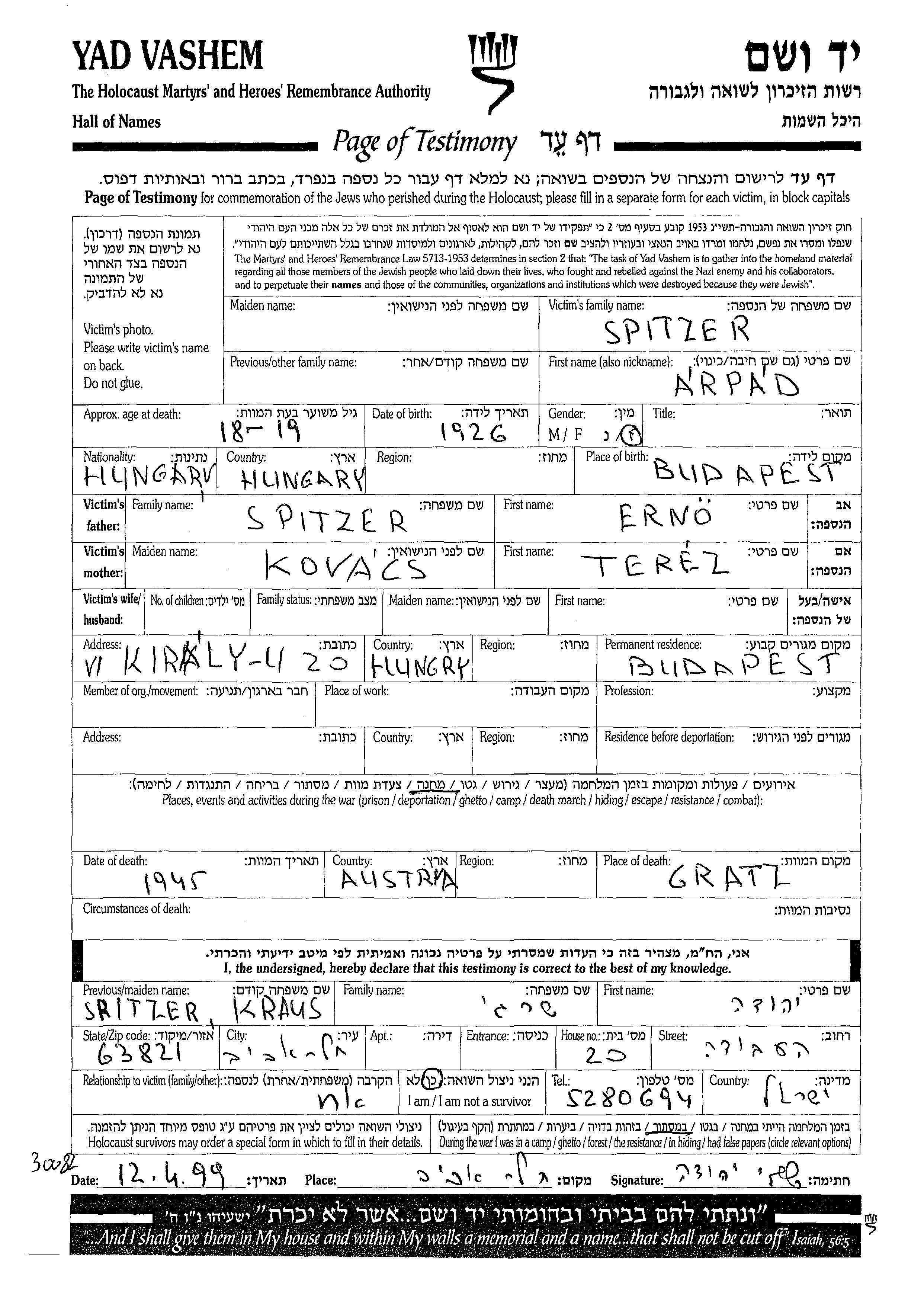 Spitzer Arpad 1926 Budapest, Hungary Page of Testimony