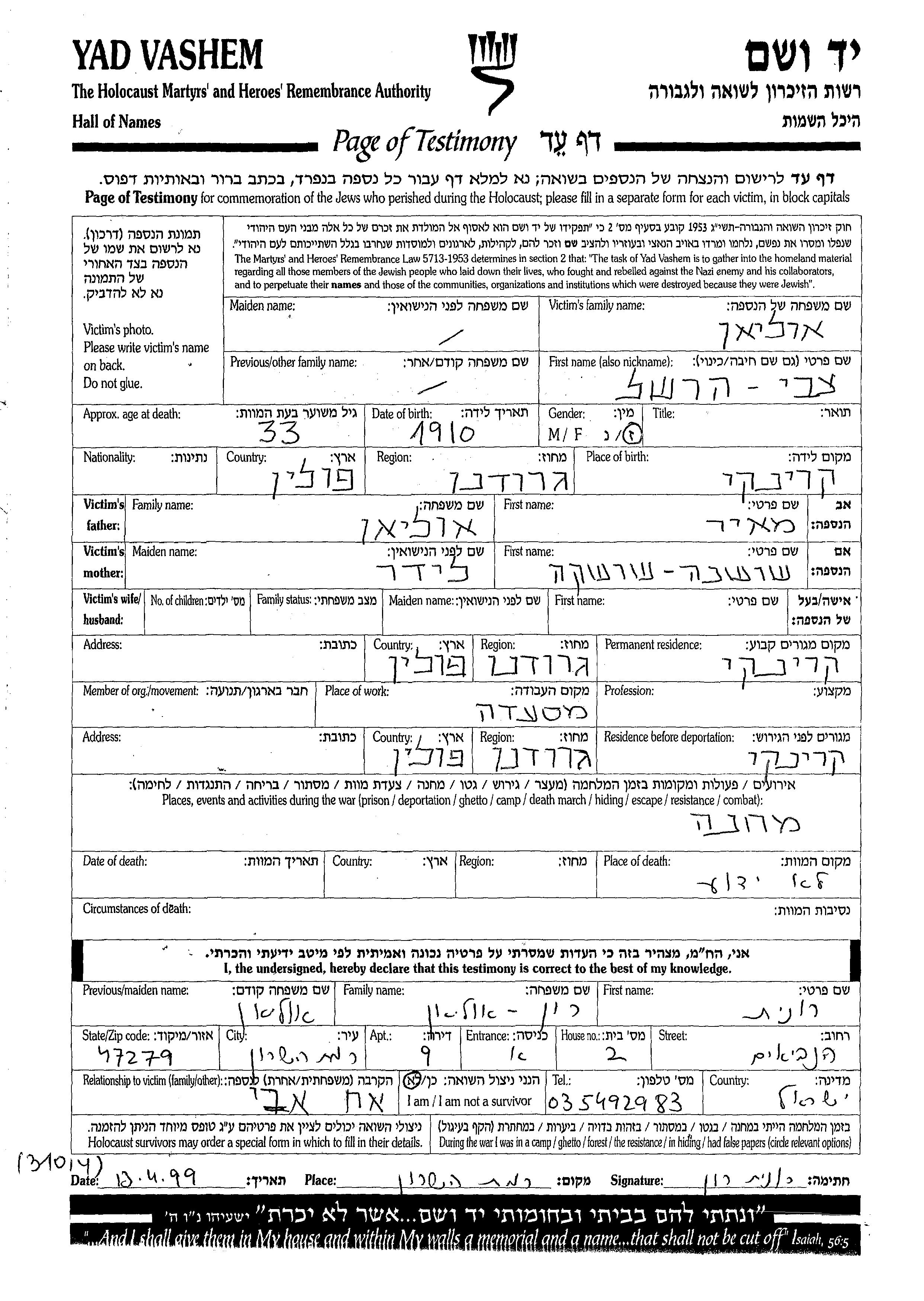 Tzvi Hershel Olian was born in Krynki, Poland, 1910 to Meir and Shoshana. Prior to WWII he lived in Krynki, Poland. During the war he was in Krynki, Poland. Tzvi Hershel was murdered in the Shoah.