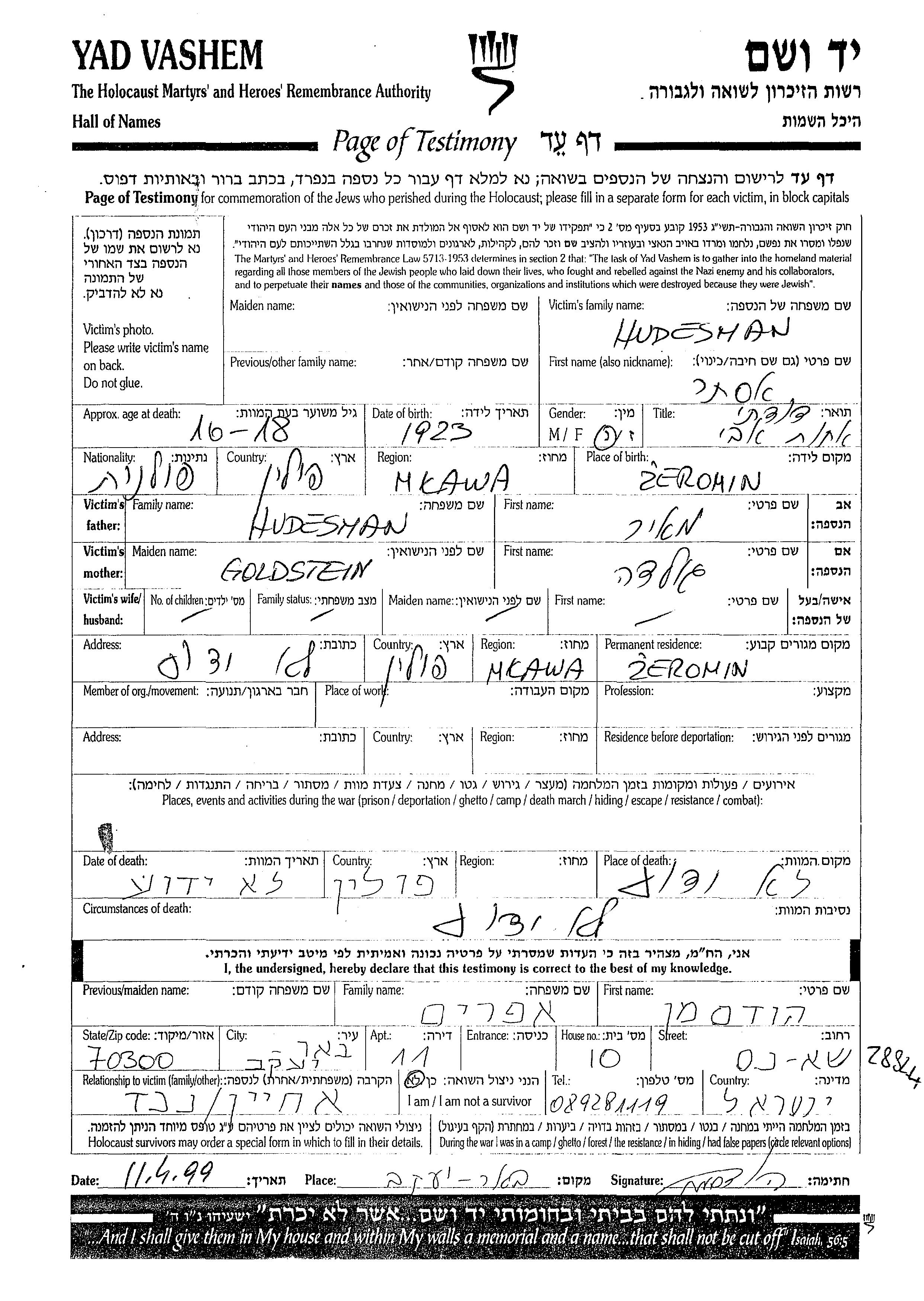 Hudesman Ester 1923 Zuromin, Poland Page of Testimony