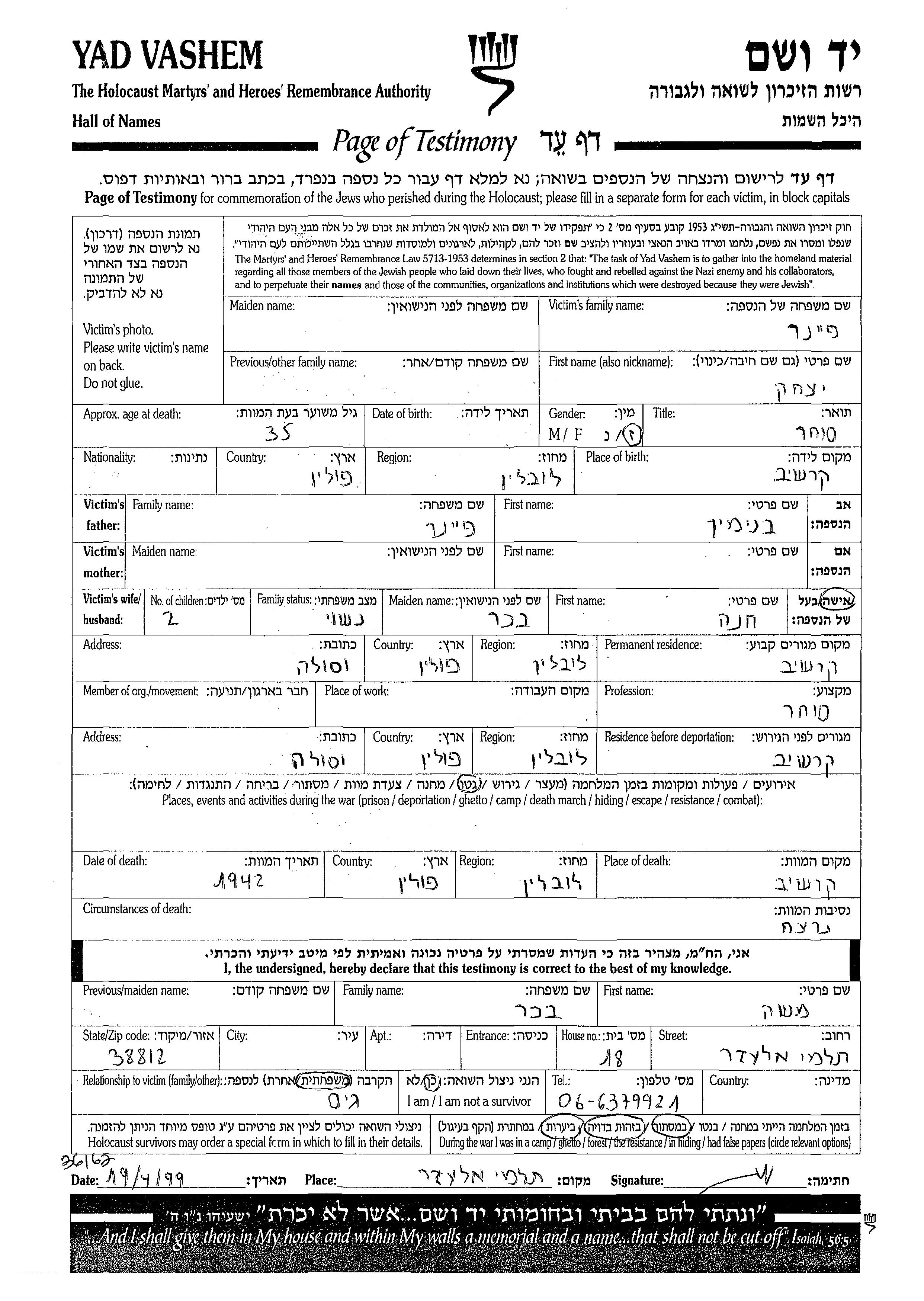 Yitzkhak Feiner was born in Krzeszow, Poland to Beniamin. He was a merchant and married to Khana nee Bekher. Prior to WWII he lived in Krzeszow, Poland. During the war he was in Krzeszow, Poland. Yitzkhak was murdered in the Shoah. Place of death: Krzeszow, Poland, 1942.
