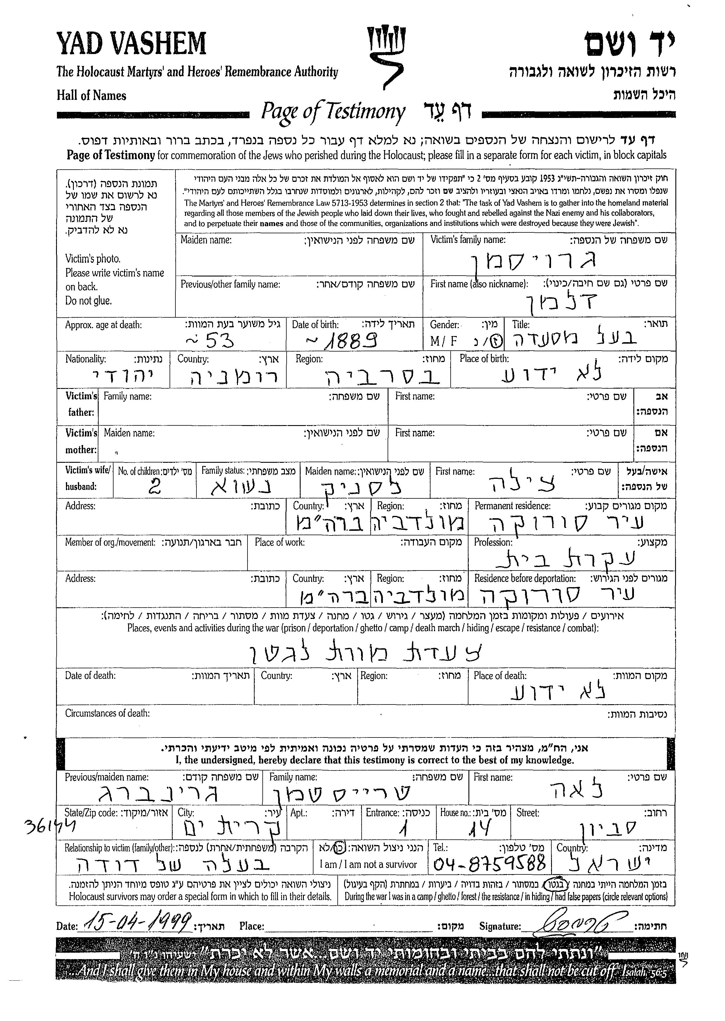 Zalman Groisman was born in Bessarabia, Romania, 1889. He was a restaurant owner and married to Tzila nee Lesnik. Prior to WWII he lived in Soroka, Romania. During the war he was in Soroka, Romania. Zalman was murdered in the Shoah.