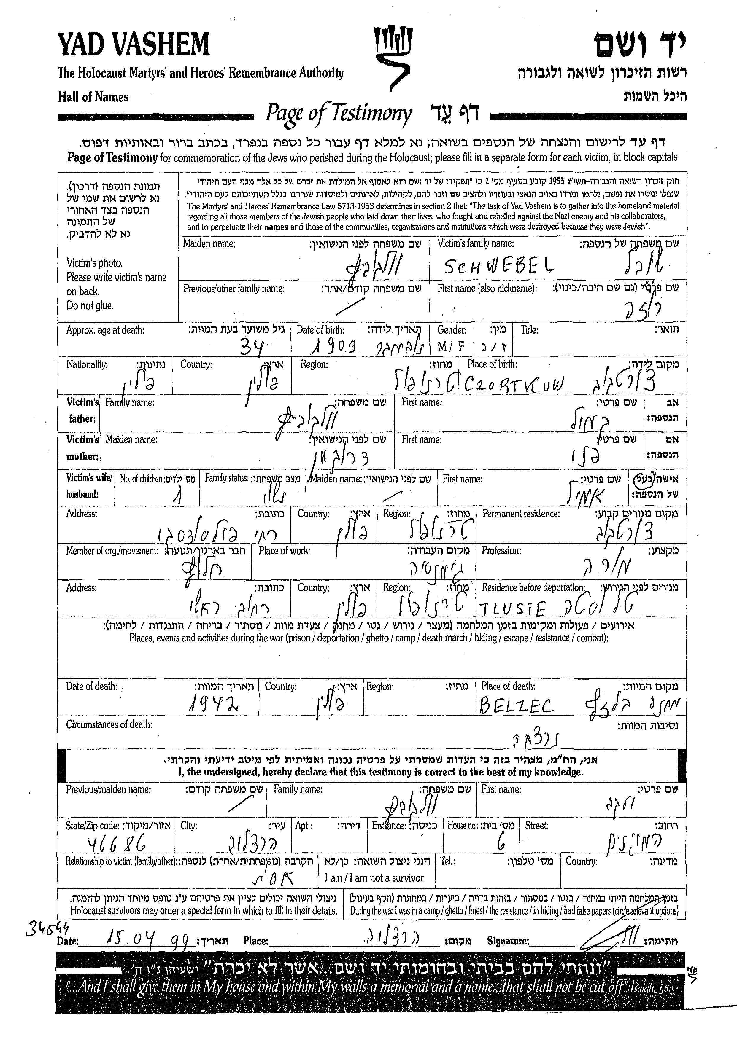 Schwebel Shuval Roza 1909 Czortkow, Poland Page of Testimony