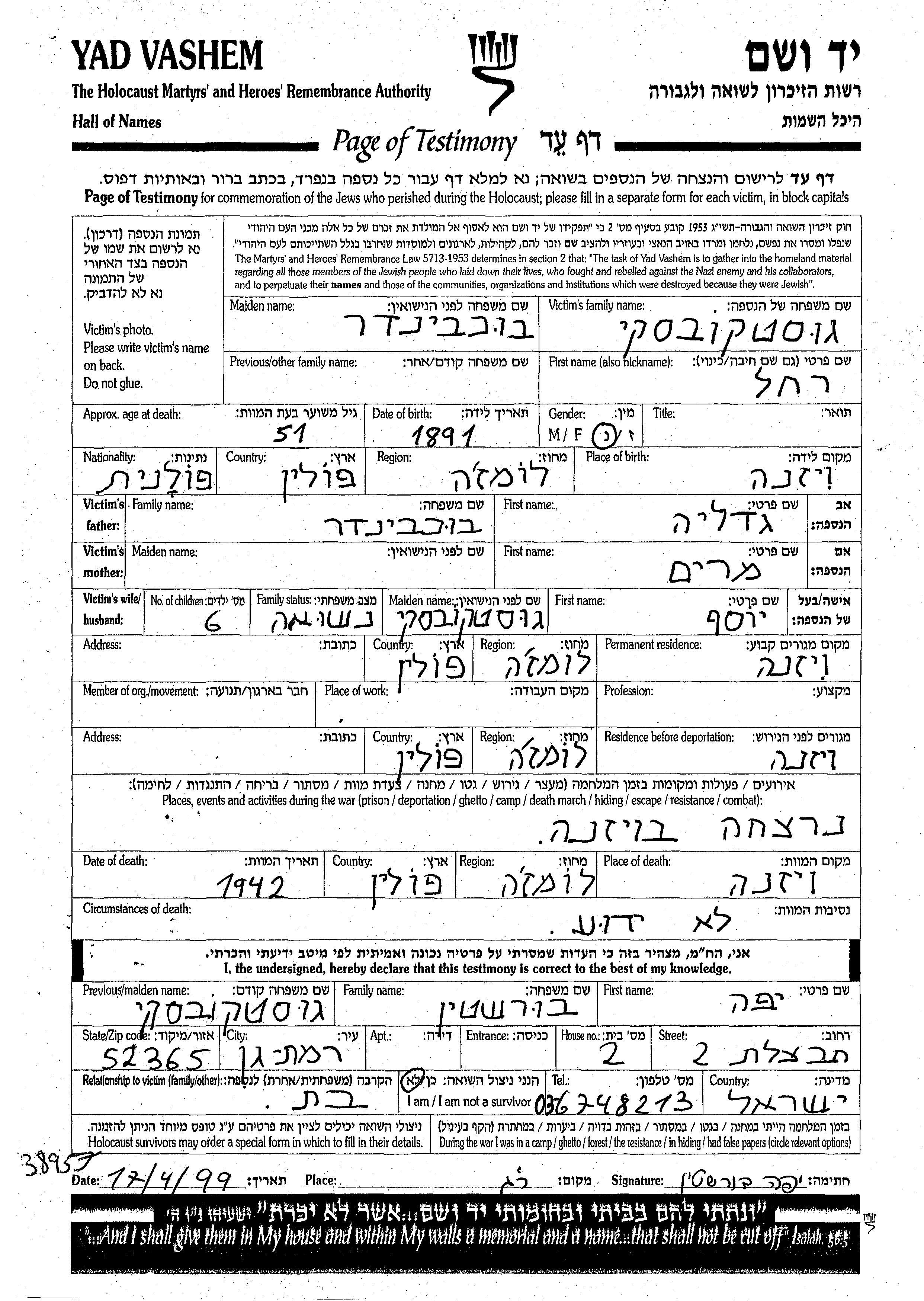 Rakhel Gostkovski nee Bukhbinder was born in Wizna, Poland, 1891 to Gedalia and Miriam. She was married to Yosef. Prior to WWII she lived in Wizna, Poland. During the war she was in Wizna, Poland. Rakhel was murdered in the Shoah. Place of death: Wizna, Poland, 1942.