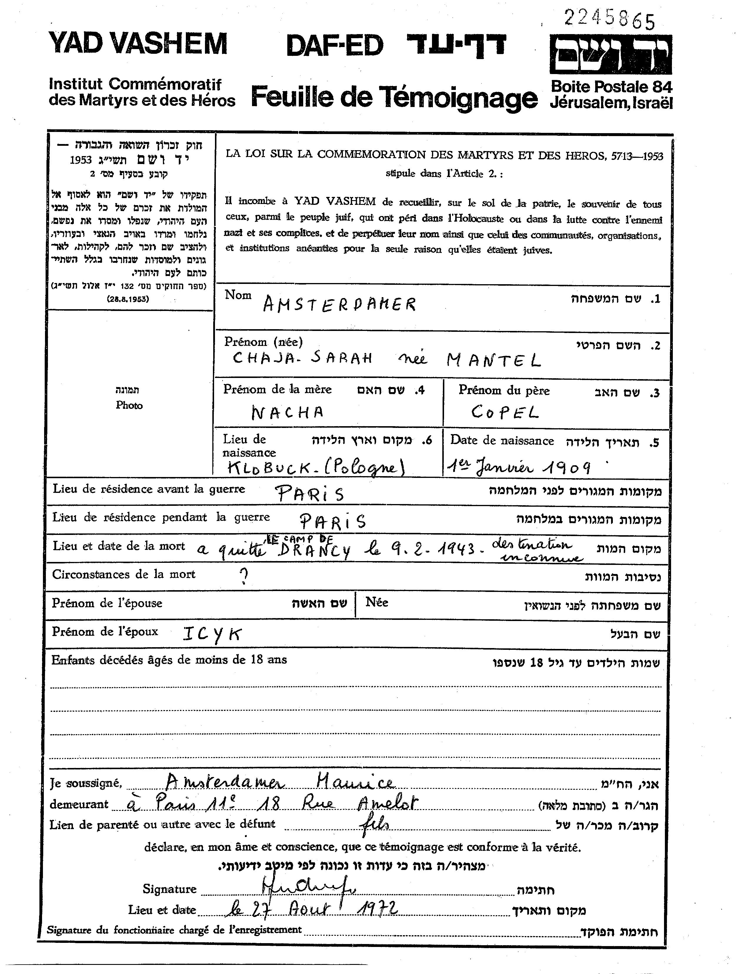 | Amsterdamer | Sara | Paris, France | Page of Testimony | |