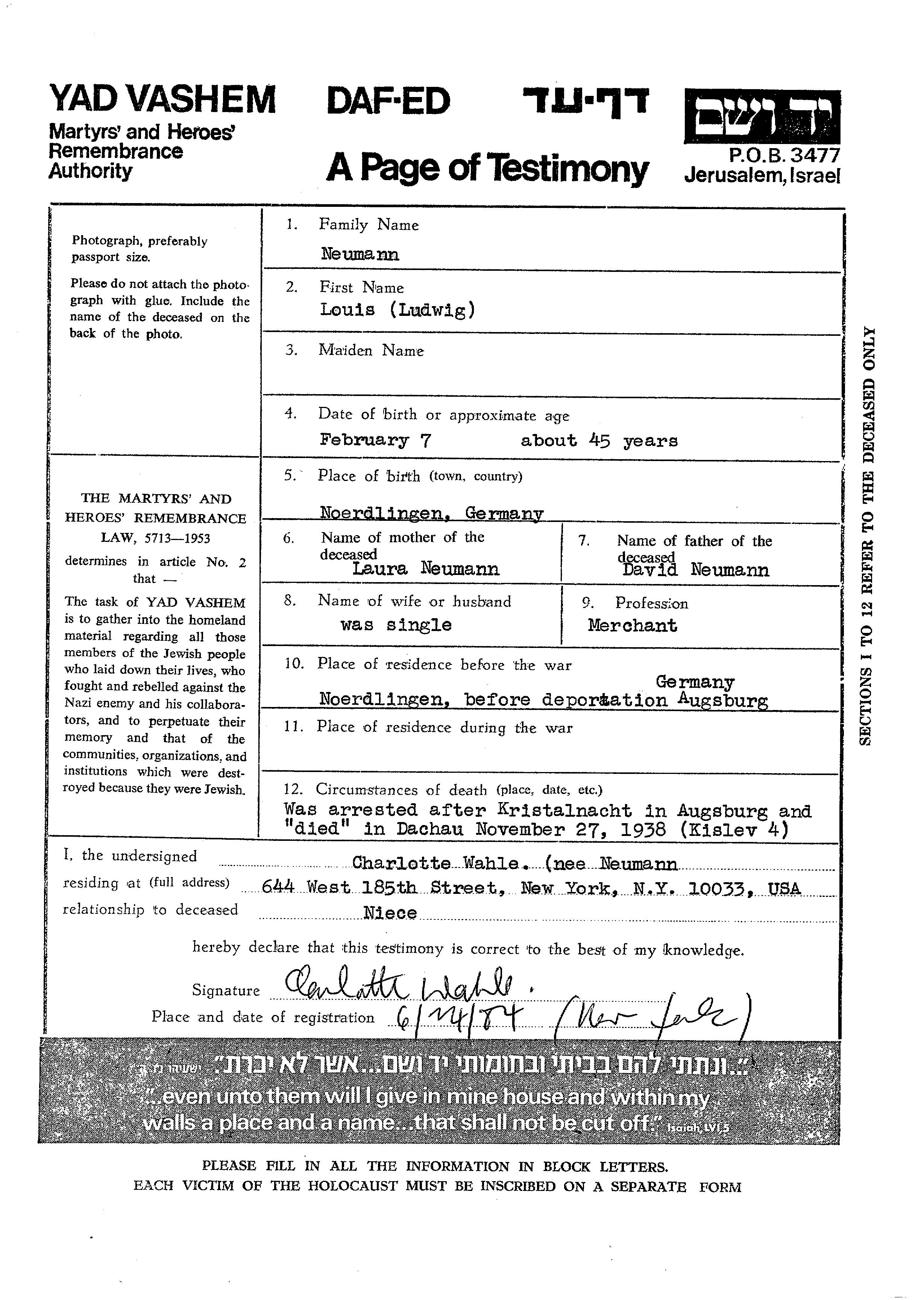 Neumann | Louis Ludwig | Noerdlingen, Germany | Page of Testimony | |