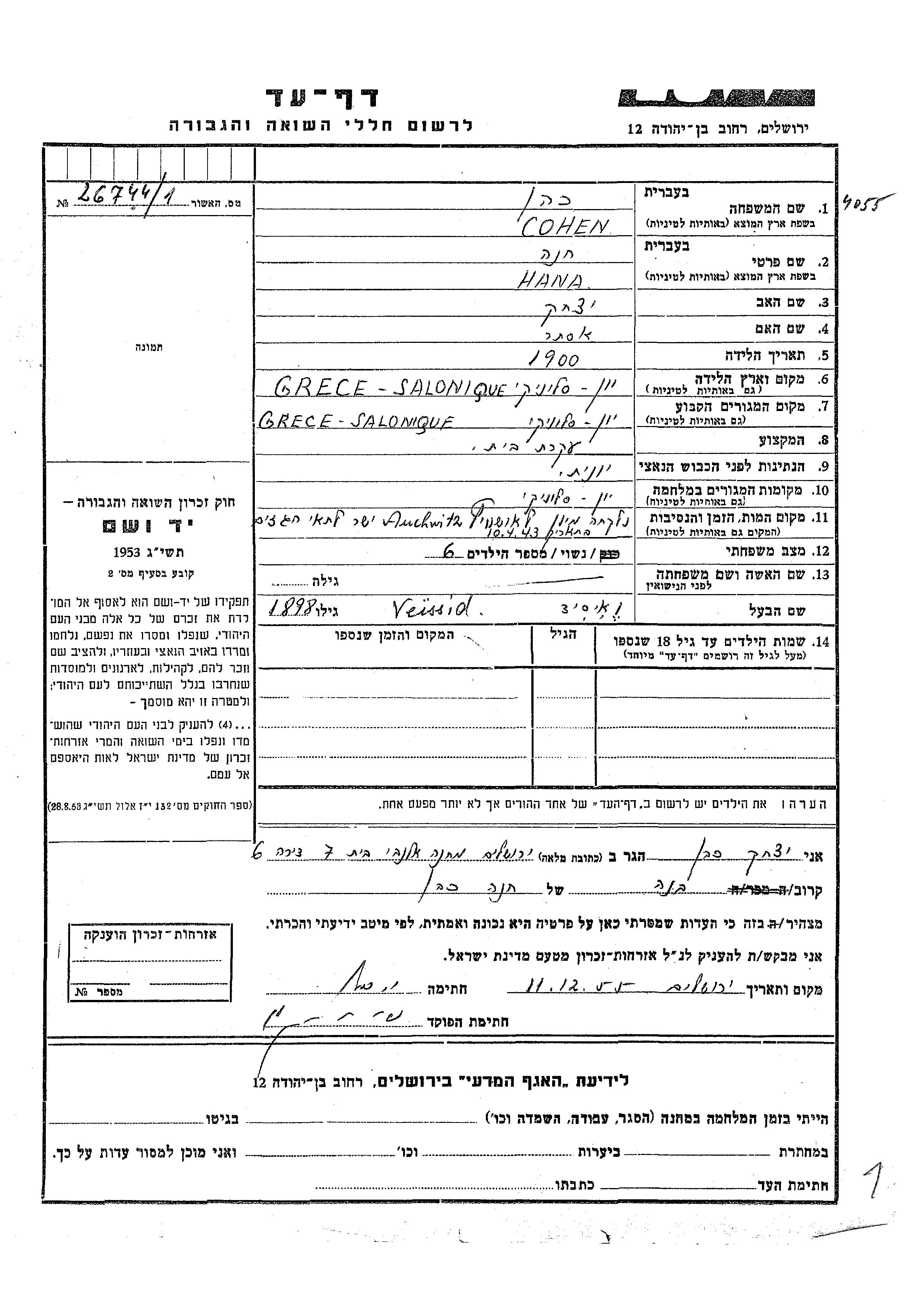 | Cohen | Hana | 1900 | Saloniki, Greece | Page of Testimony |