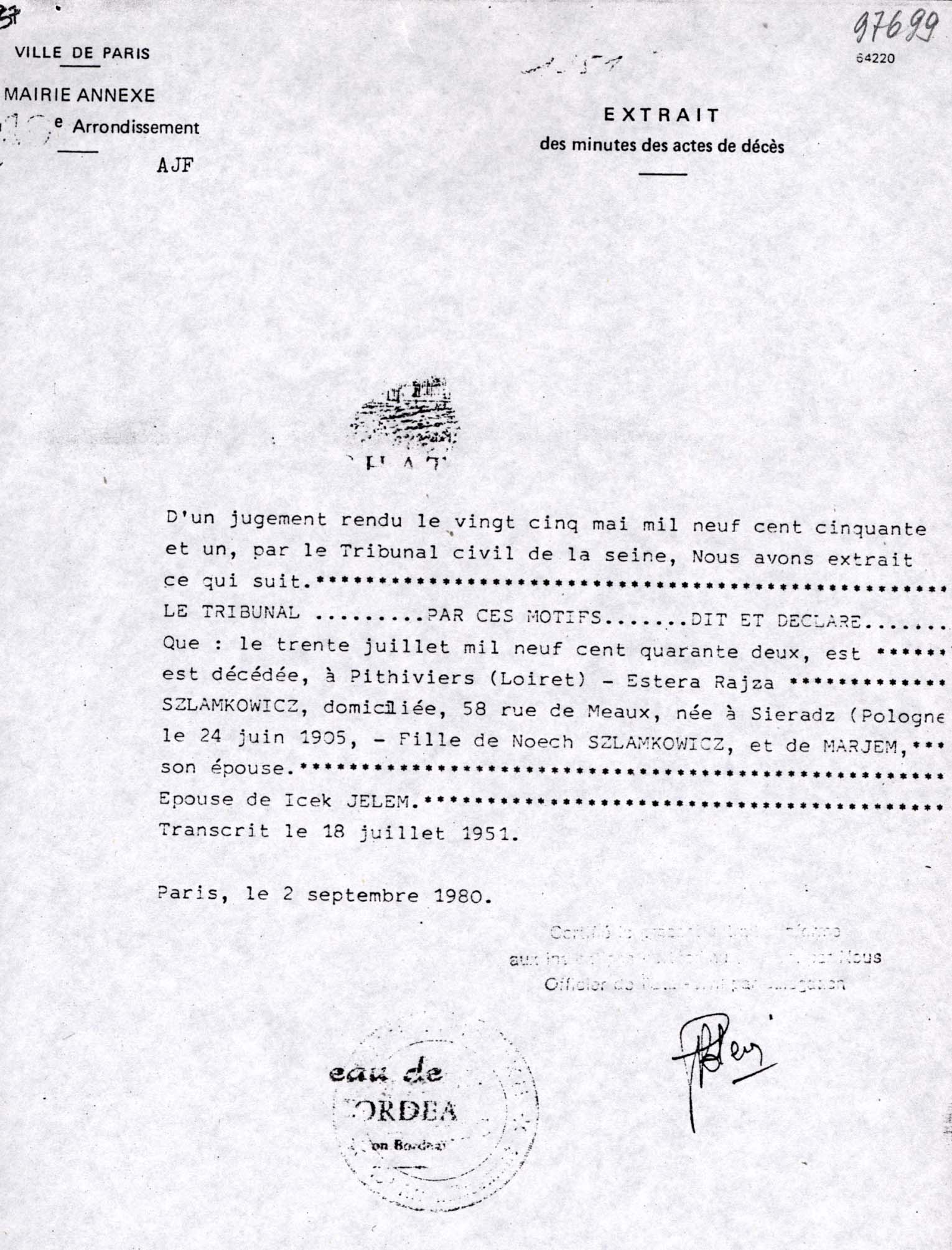 | Jelen | Estera | 1905 | Paris, France | List of deportation from France |