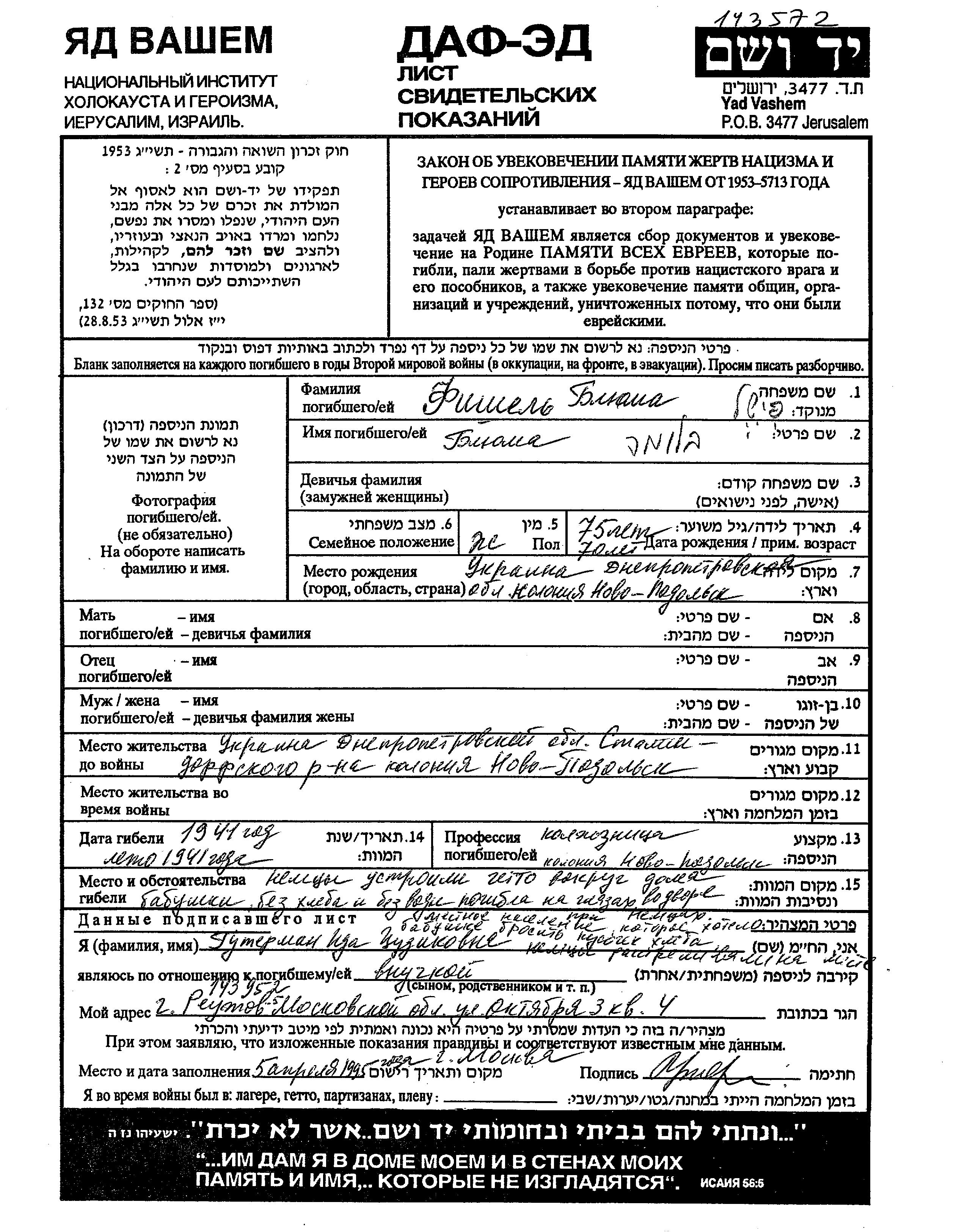 Fishel Blyuma 1870 Novopodolsk, Ukraine (USSR) Page of Testimony