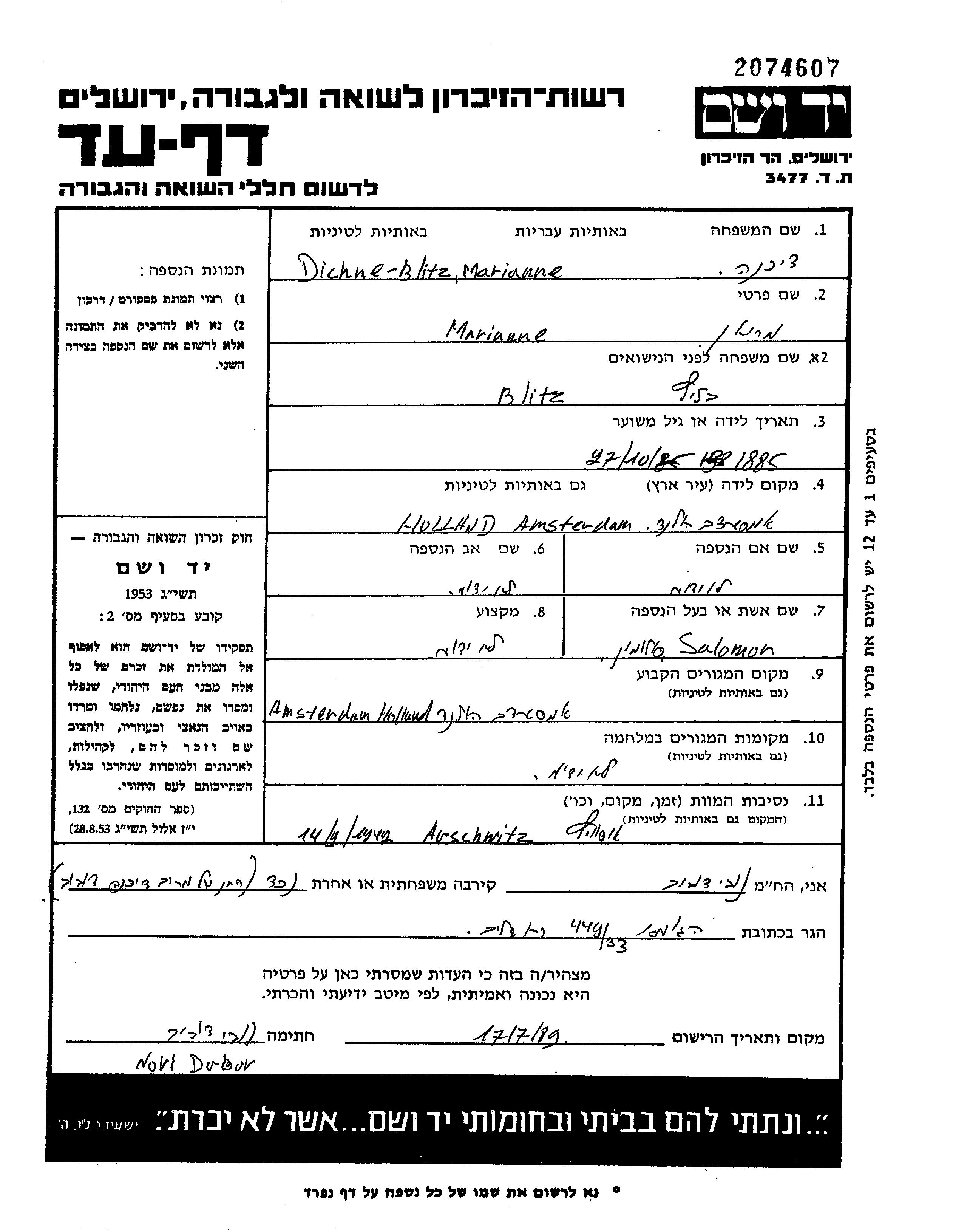 Dichne Marianne Marian 1885 Amsterdam, The Netherlands Page of Testimony