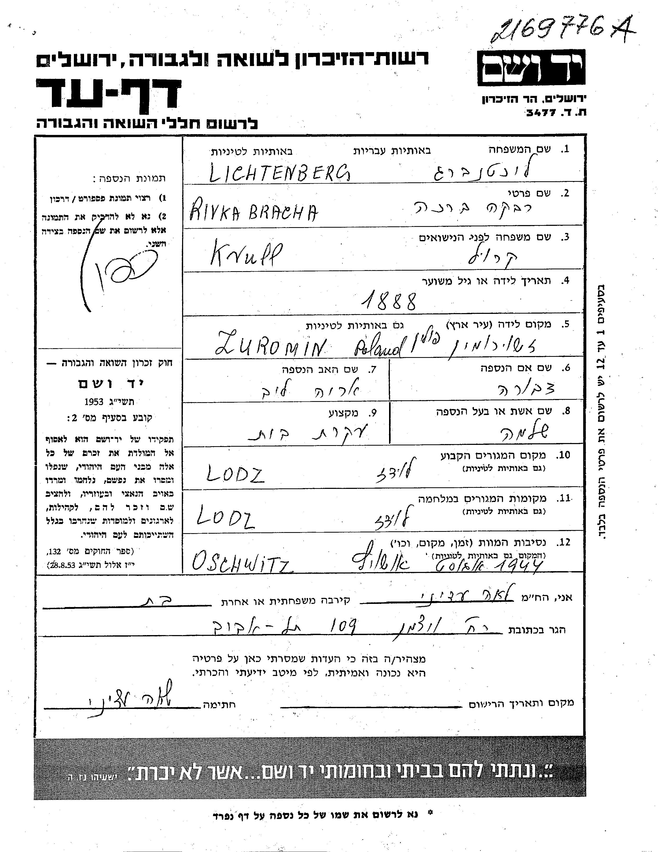 | Lichtenberg | Rivkah Bracha | 1888 | Lodz, Poland | Page of Testimony |