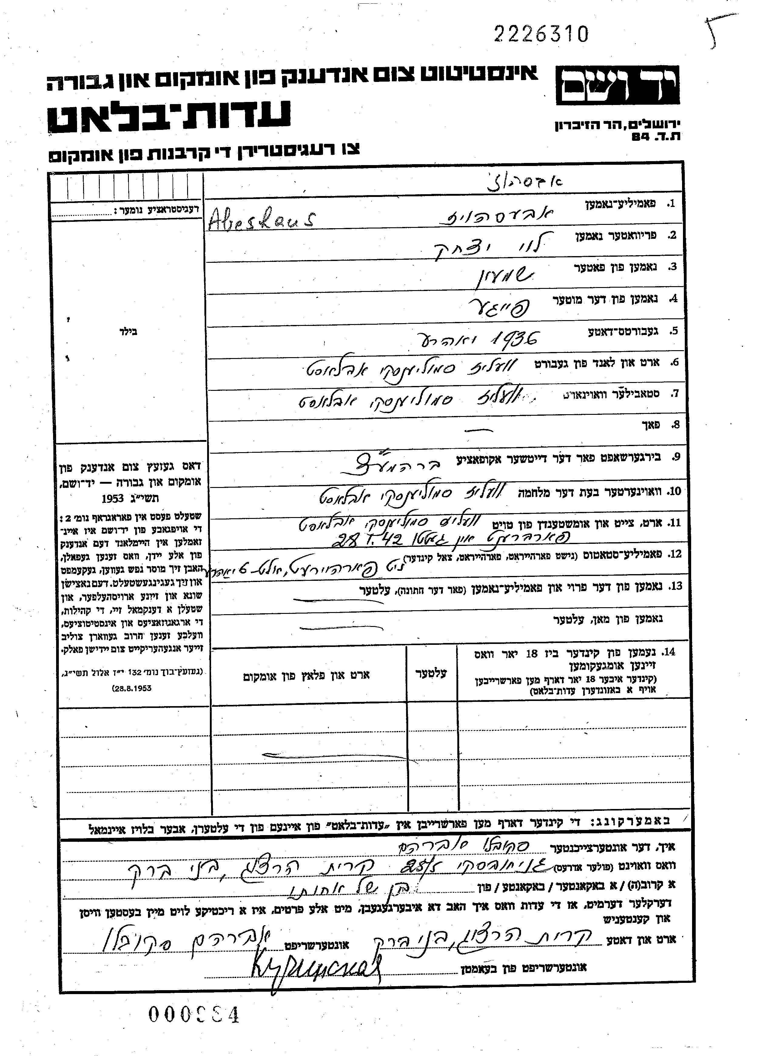 Abeshaus Yitzkhak Levi 1936 Velizh, Russia (USSR) Page of Testimony