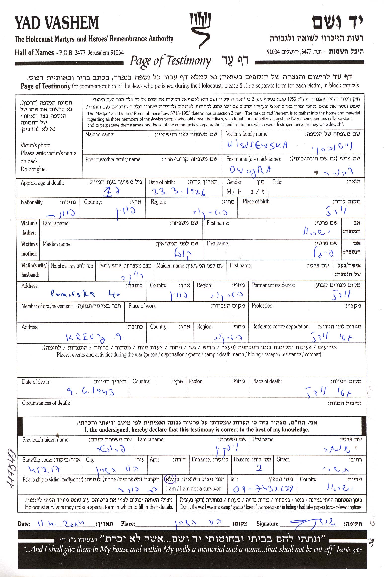| Wisniewska | Dwojra | 1926 | Lodz, Poland | Page of Testimony |