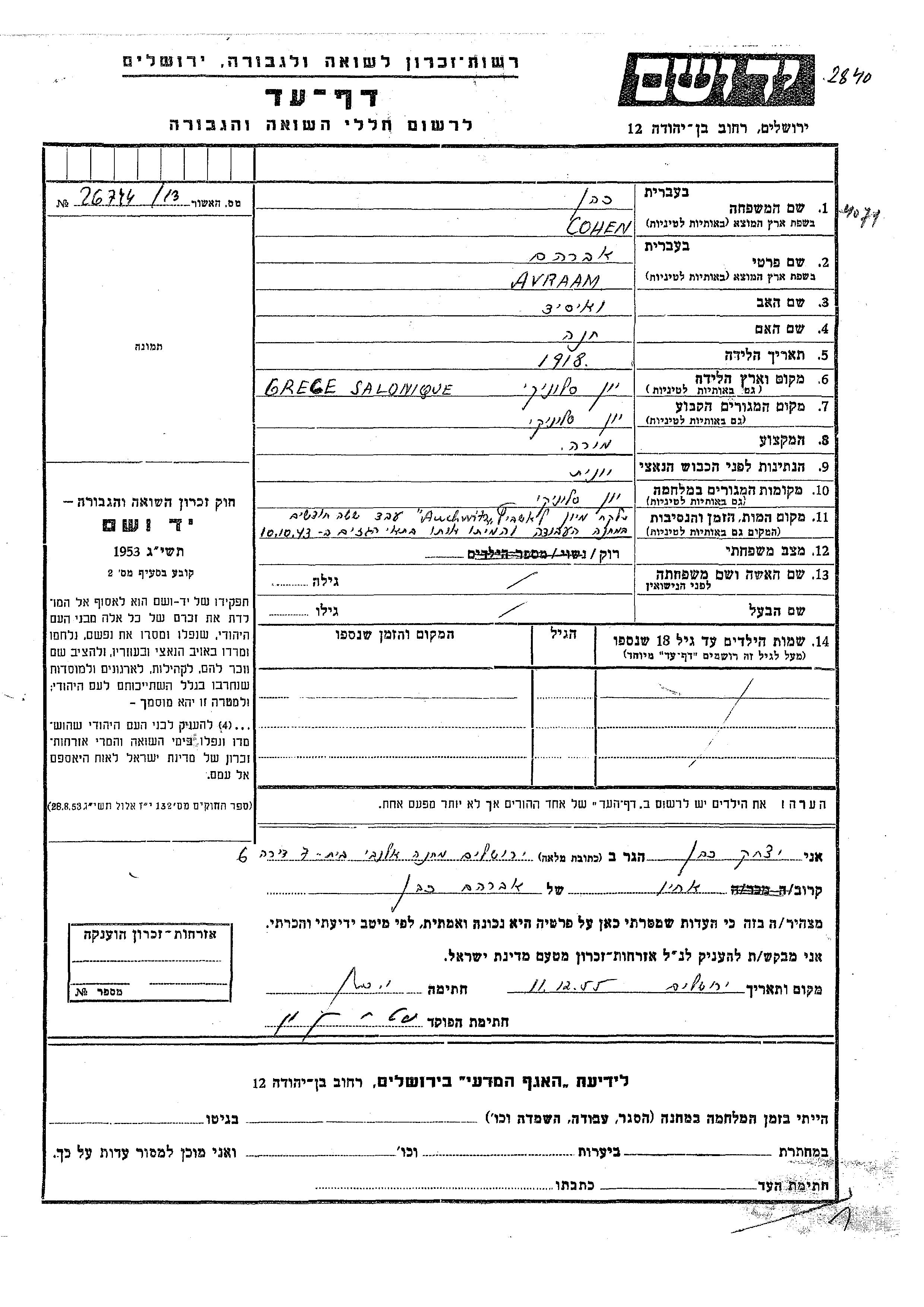 | Cohen | Avraam | 1918 | Saloniki, Greece | Page of Testimony |