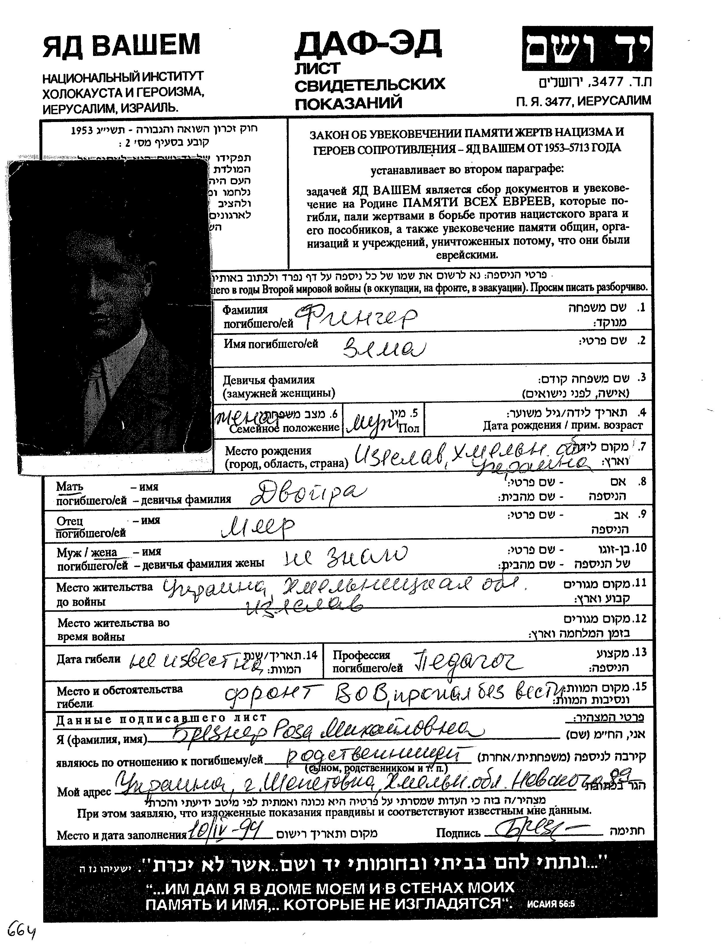 | Finger | Zyama | Izyaslav, Ukraine (USSR) | Page of Testimony | |