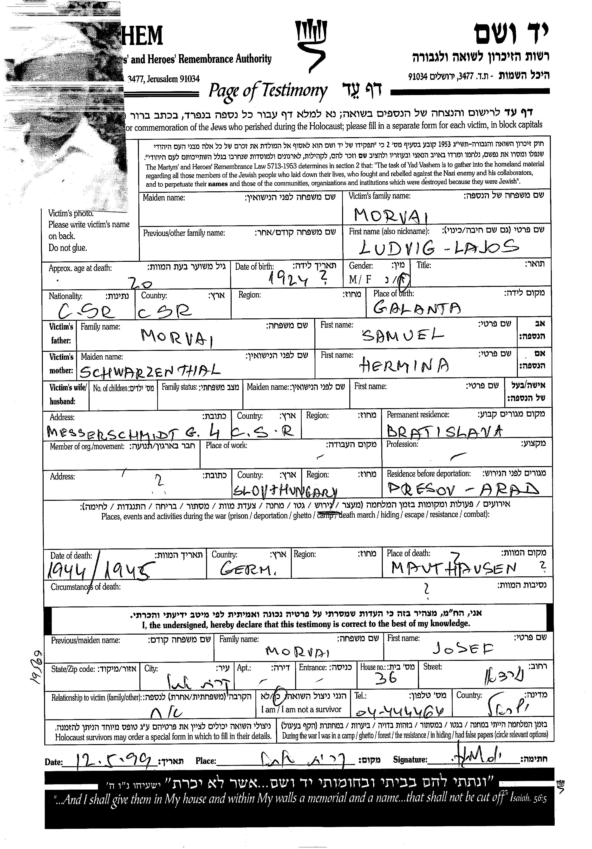 | Morvai | Ludvig Lajos | 1924 | Bratislava, Czechoslovakia | Page of Testimony |