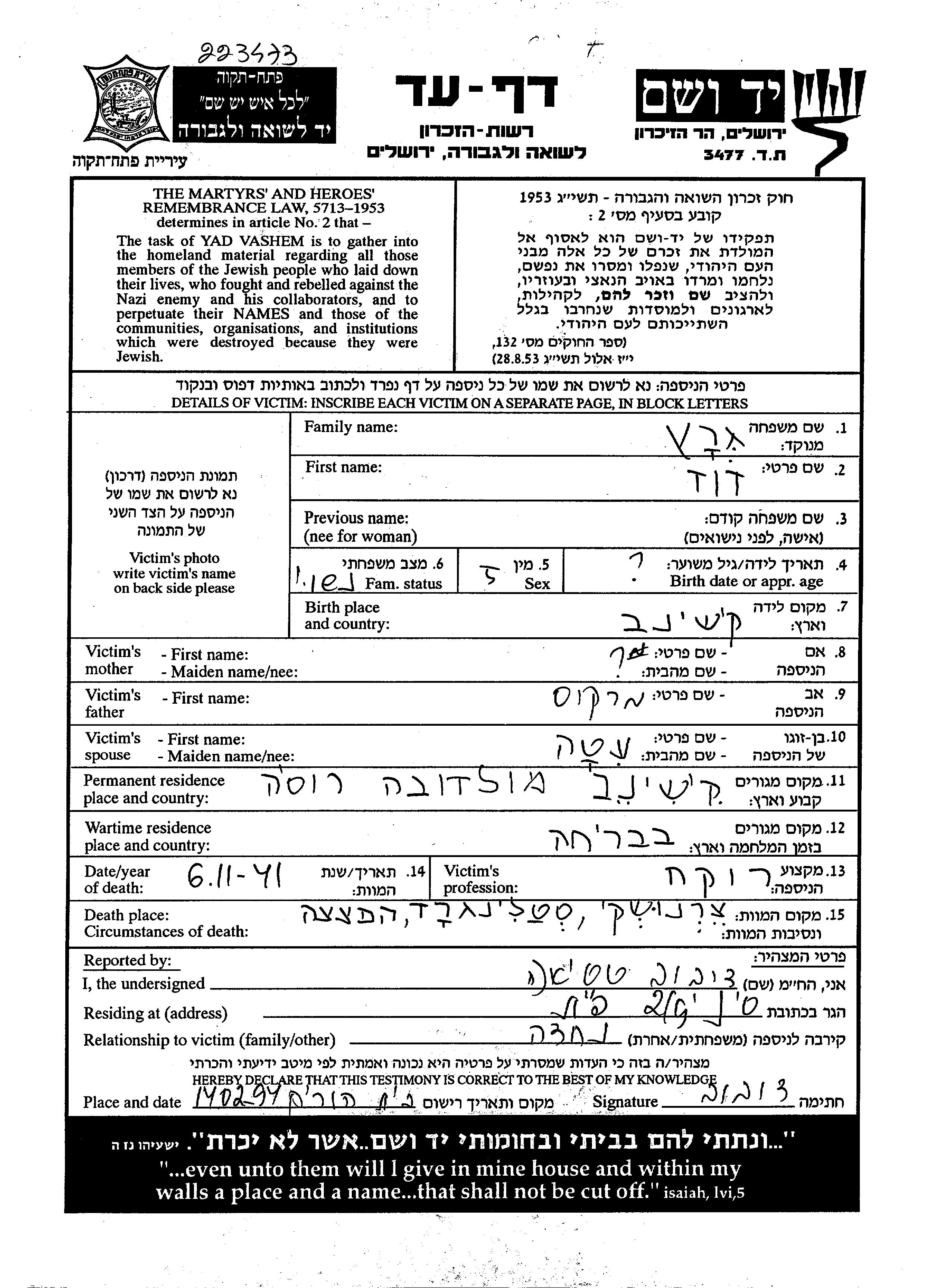 Grach David Kishinev, Romania Page of Testimony