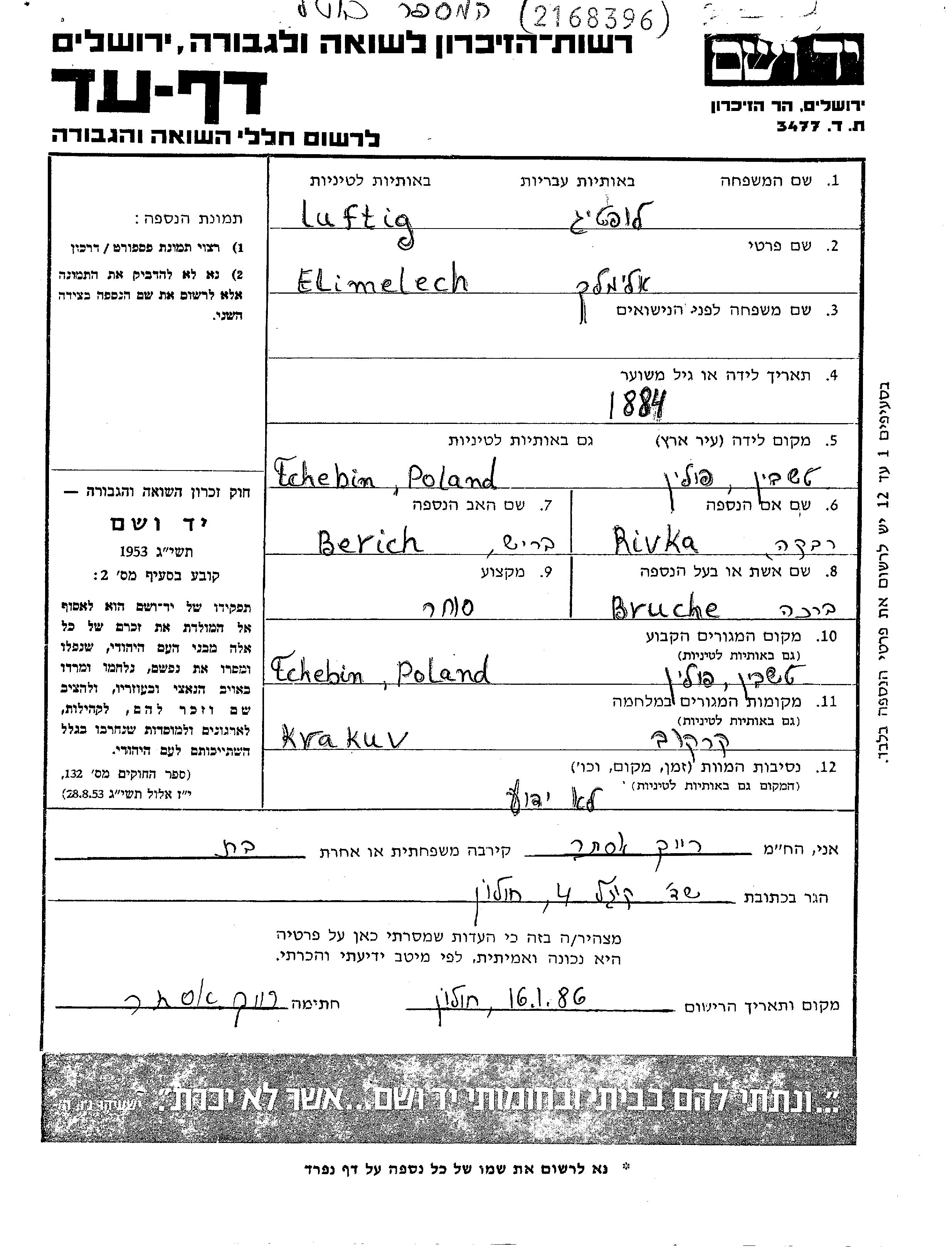 Luftig | Elimelech | 1884 | Cebinja, Poland | Page of Testimony |