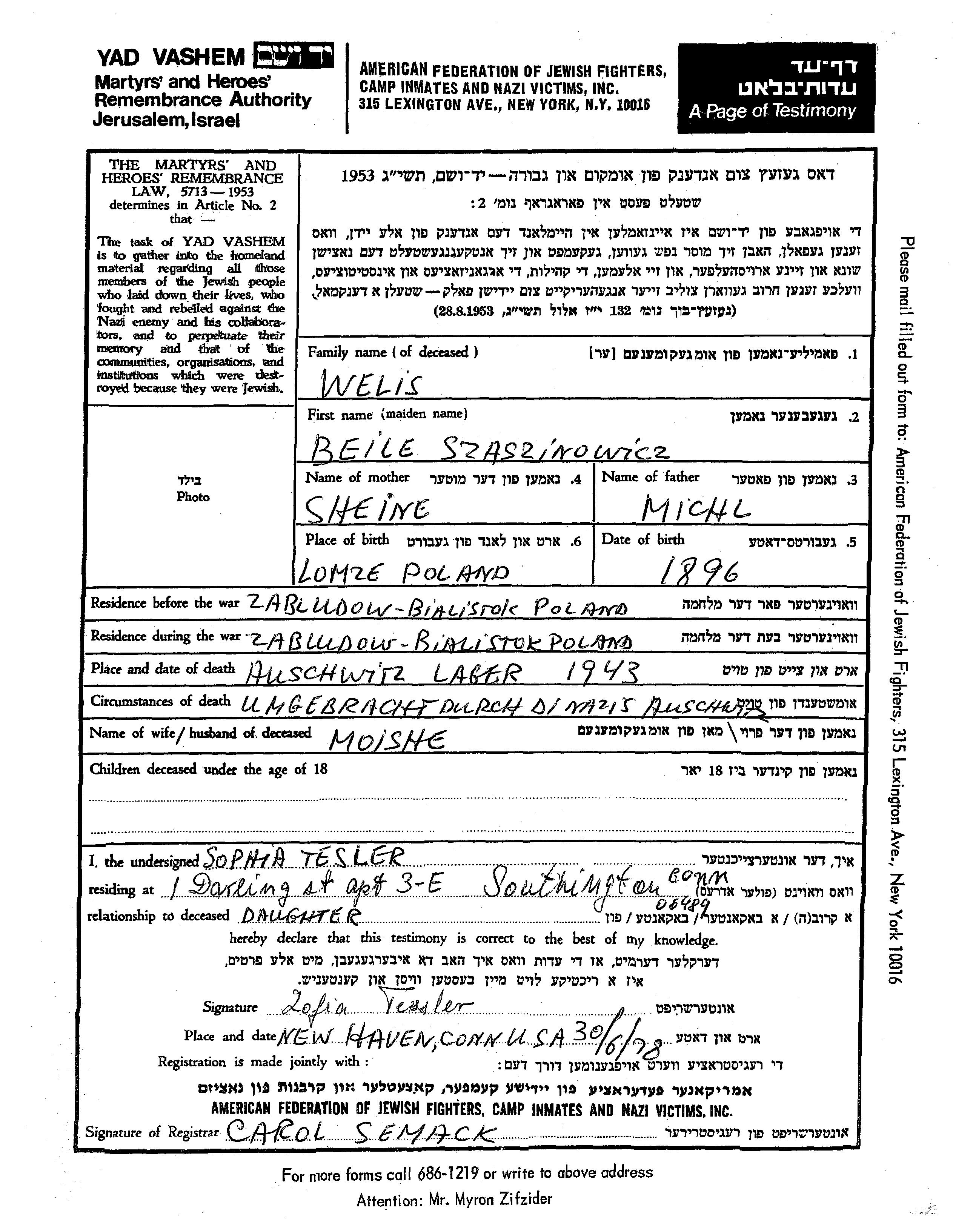 Welis Tesler Sophia Zabludow, Poland Page of Testimony