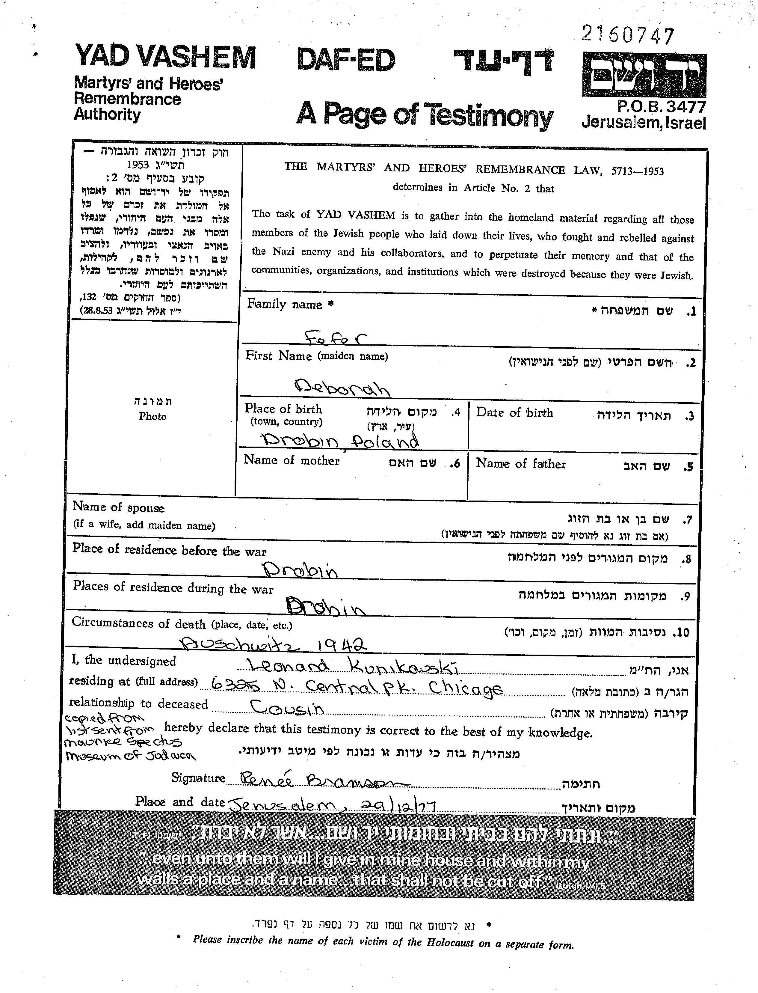 Fefer | Deborah | Drobin, Poland | Page of Testimony | |
