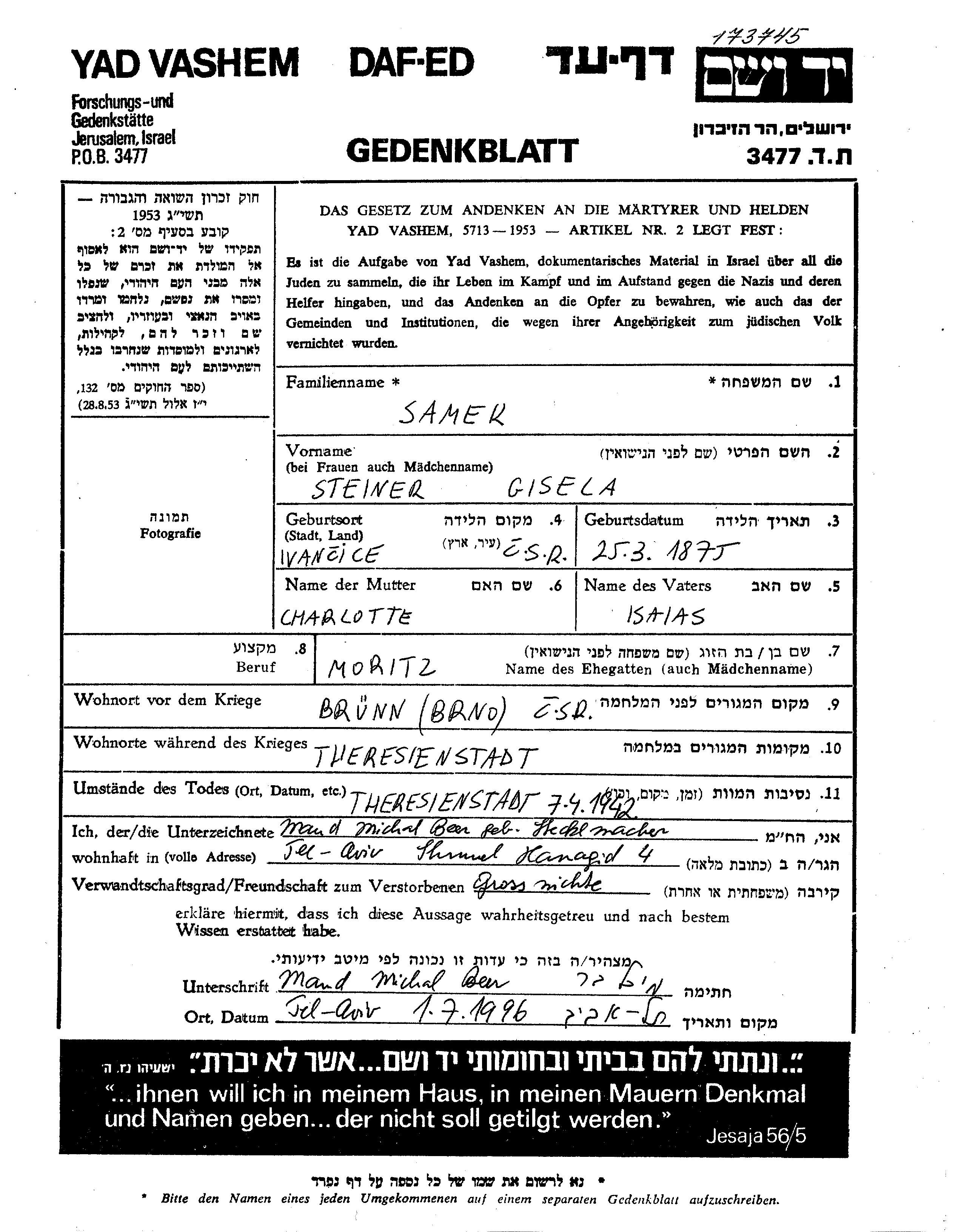 Samek Gisela 1875 Brno, Czechoslovakia Page of Testimony