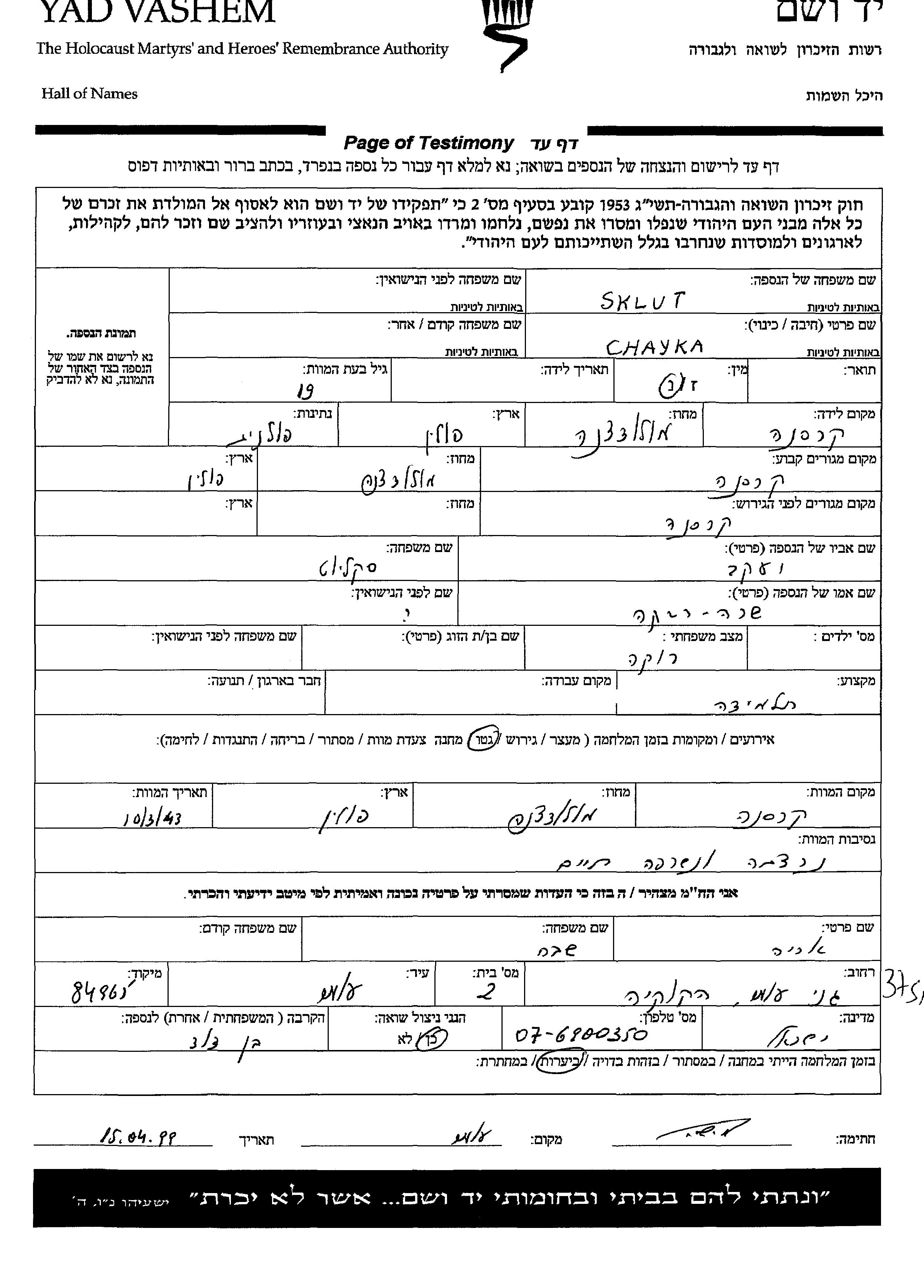 Chayka Sklut was born in Krasne, Poland to Yaakov and Sara Rivka. She was a pupil and single. Prior to WWII she lived in Krasne, Poland. During the war she was in Krasne, Poland.