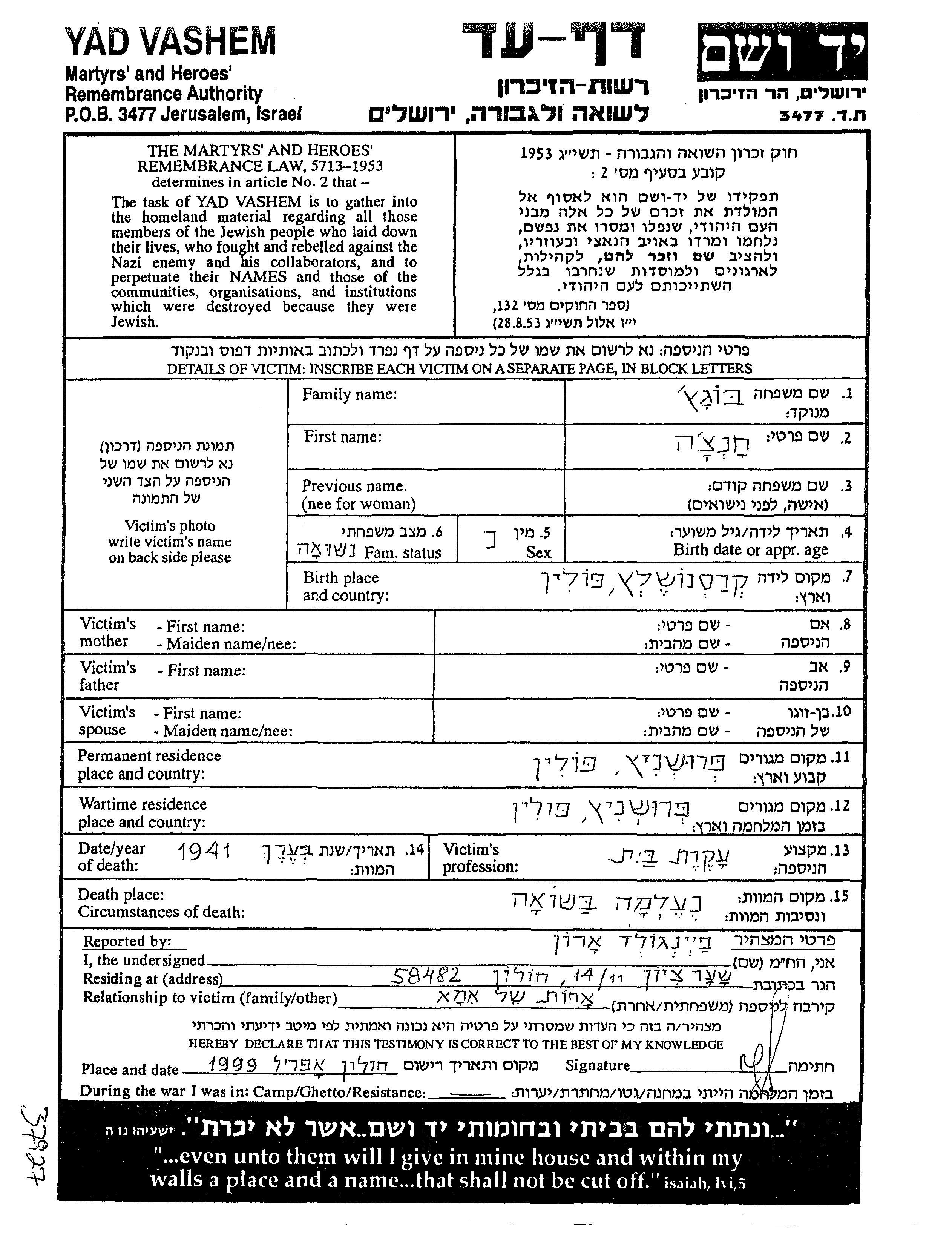 Khantze Bogach was born in Krasnosielc, Poland. She was a housewife and married. Prior to WWII she lived in Proszowice, Poland. During the war she was in Proszowice, Poland. Khantze was murdered in the Shoah. Place of death: unknown, 1941.