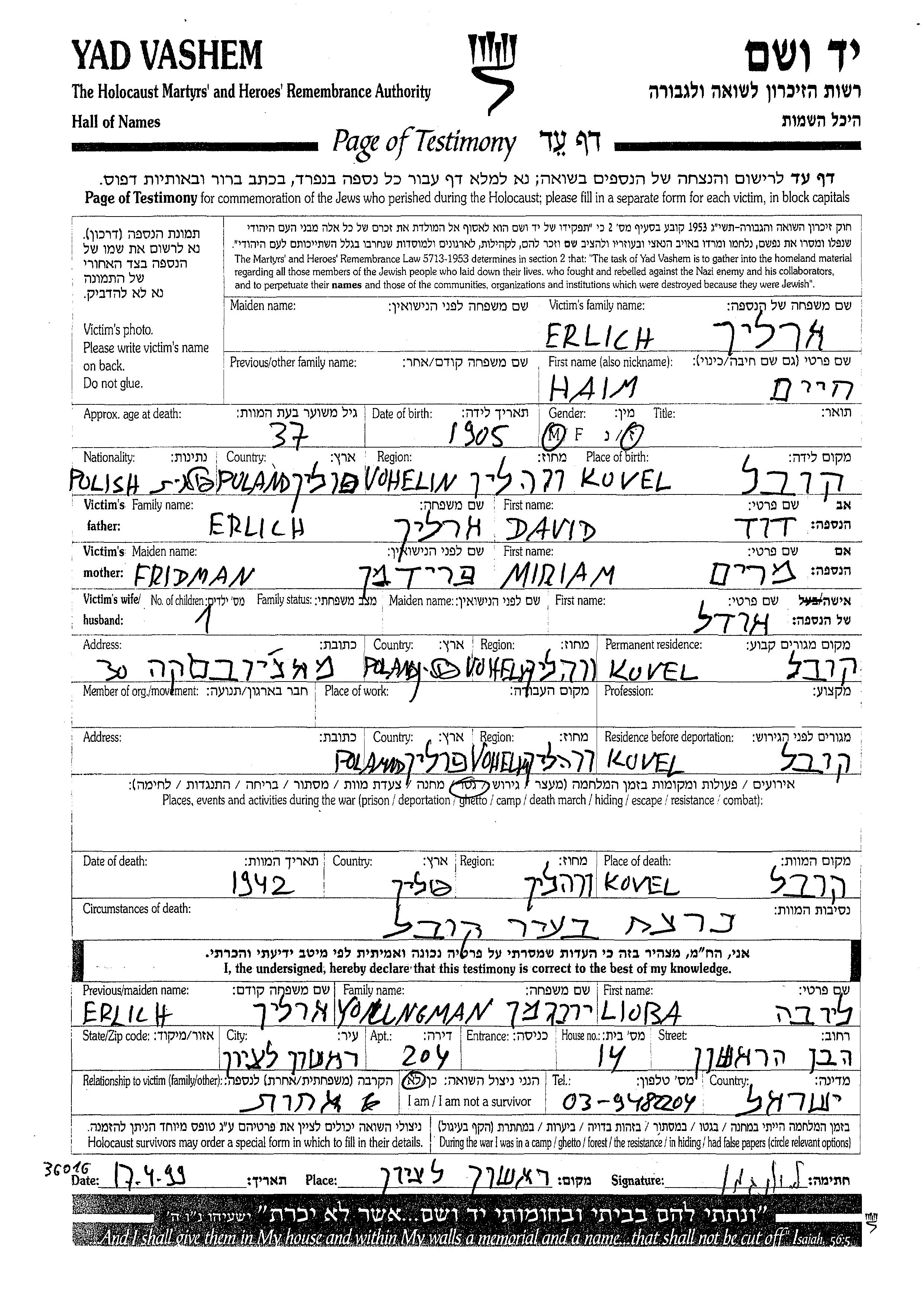 Erlich Haim 1905 Kovel, Poland Page of Testimony