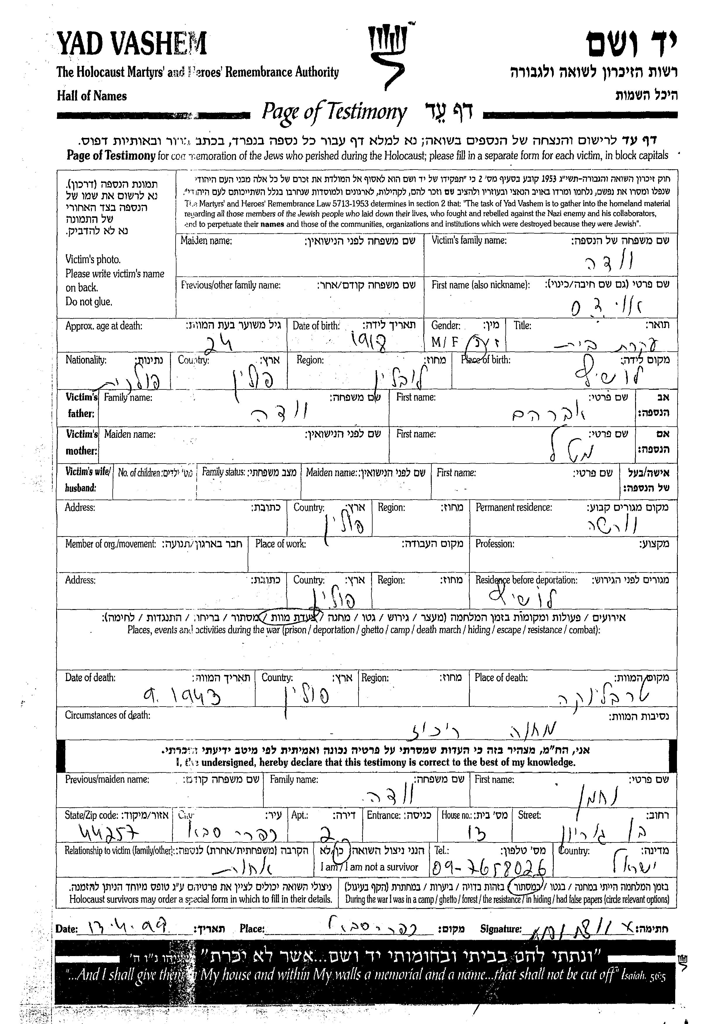 Udes Voda was born in Losice, Poland, 1918 to Avraham and Matl. Prior to WWII she lived in Warsaw, Poland. During the war she was in Losice, Poland. Udes was murdered in the Shoah. Place of death: Treblinka, Poland, 09/1943.