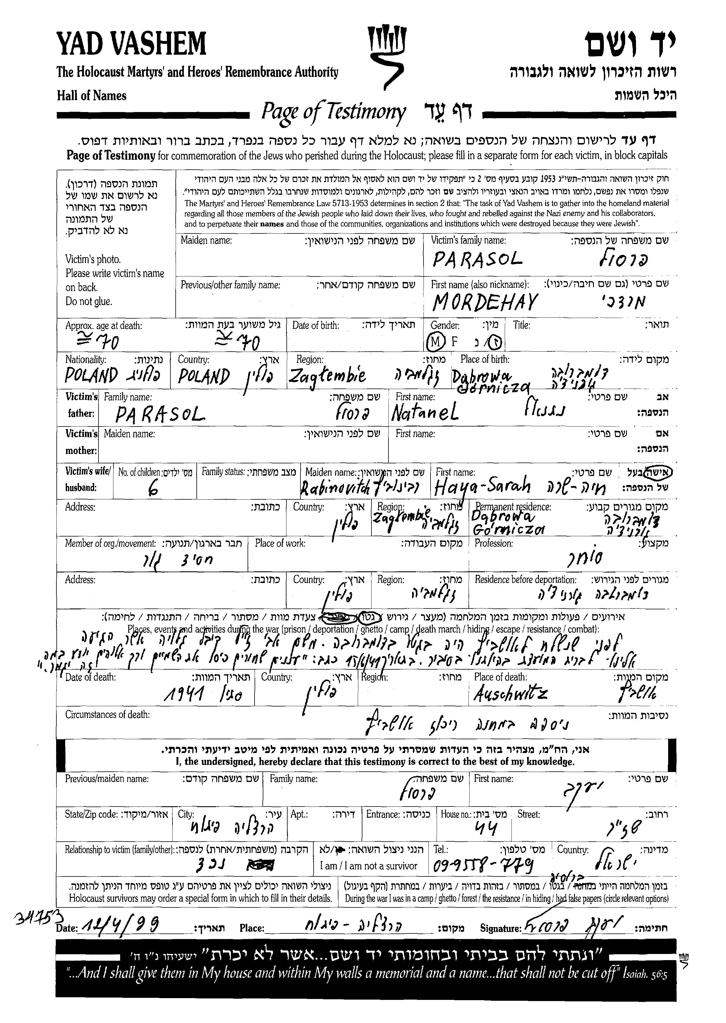Mordehay Parasol was born in Dabrowa Gornicza, Poland to Natanel. He was a merchant and married to Haya Sarah nee Rabinovitch. Prior to WWII he lived in Dabrowa Gornicza, Poland. During the war he was in Dabrowa Gornicza, Poland. Mordehay was murdered in the Shoah. Place of death: Auschwitz, Poland, 1941.