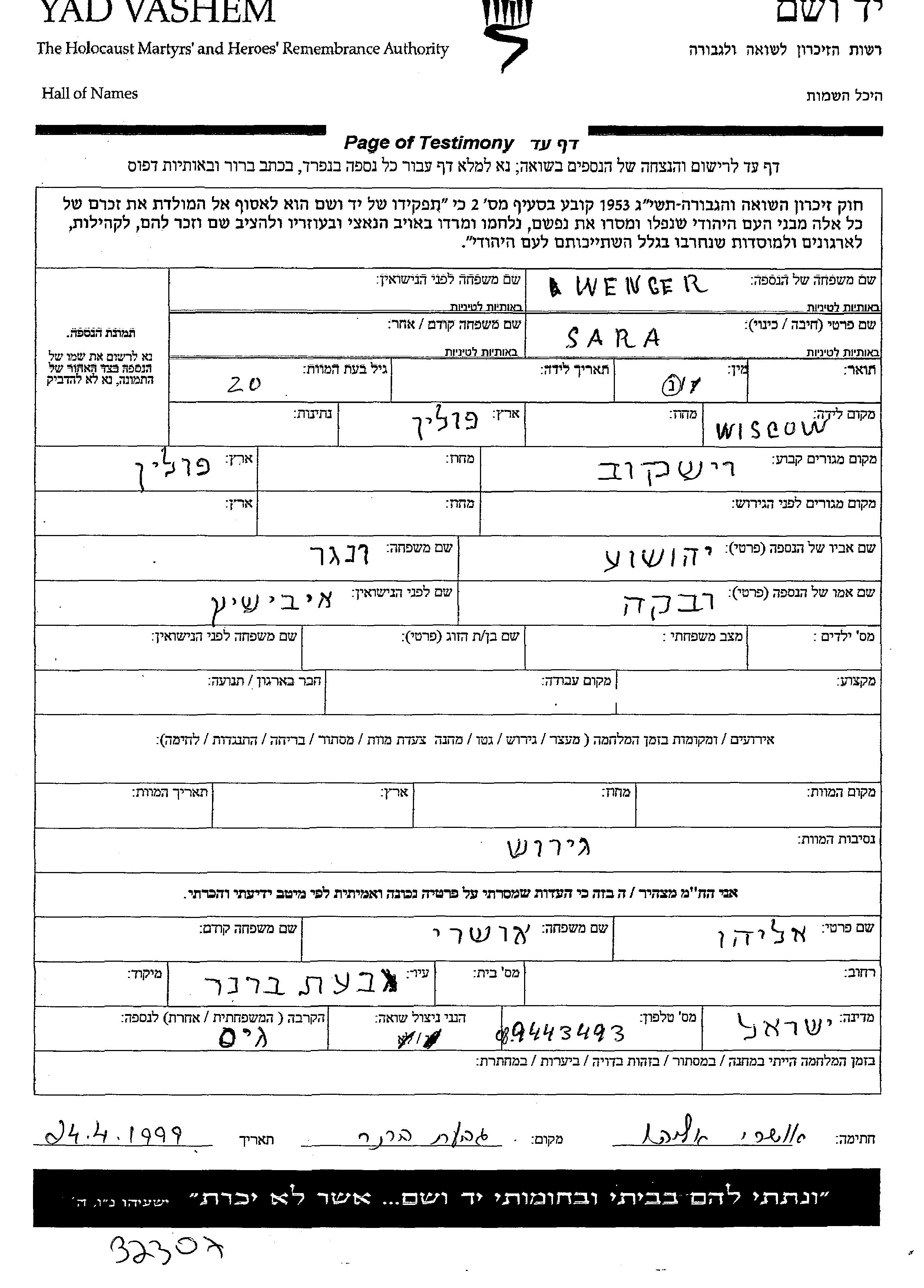 Wenger Sara Wyszkow, Poland Page of Testimony
